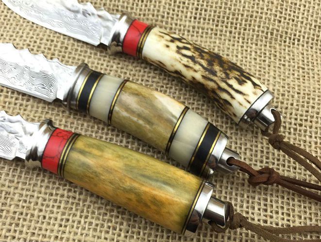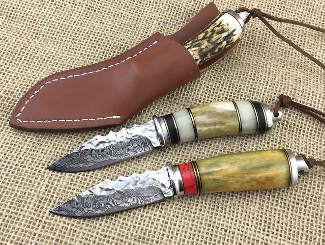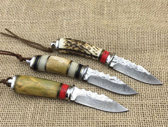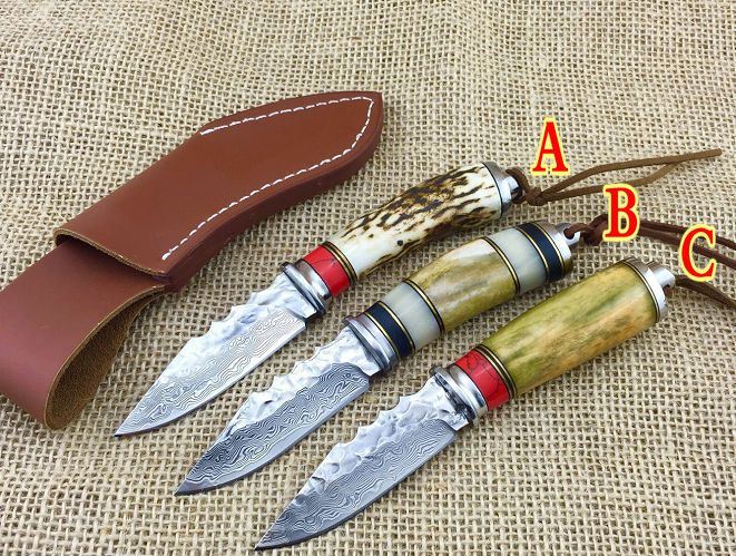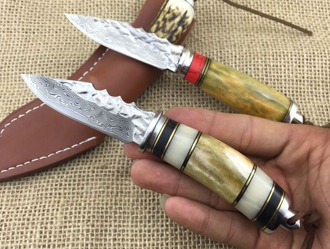 小鳄鱼大马士革刀 全长:17.5cm 刃长:8cm 柄长:9.5cm 厚度:4mm 硬度:59HRC 最宽处:2.4cm 钢材:大马士革钢 柄材:白钢护手+鹿角+牛骨 重量:110g 包装:皮套+黑色盒