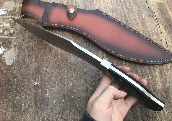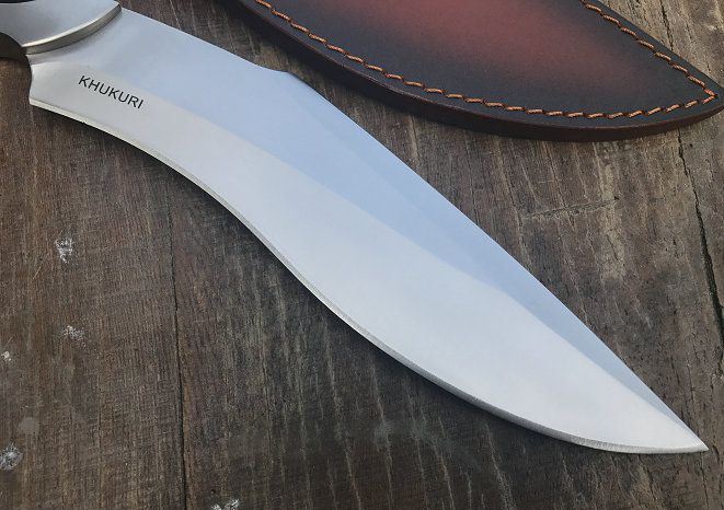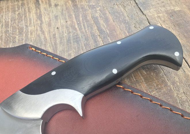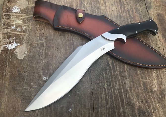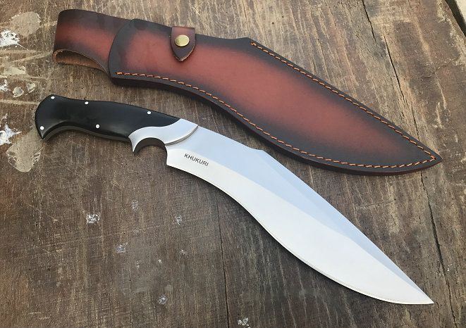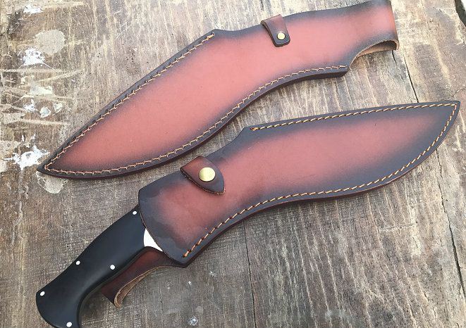 新版廓尔喀统治者手工狗腿弯刀 全长:39cm 刃长:26cm 柄长:13cm 厚度:6.0mm 硬度:60+- 钢材:9CR18MOV (锻打) 柄材:G10 表面:砂光 重量:598g 刀鞘:牛皮刀鞘