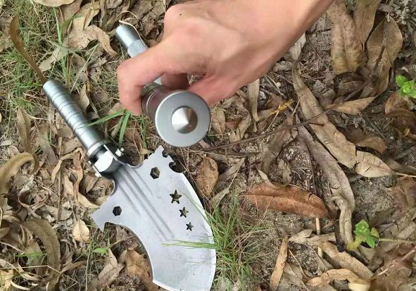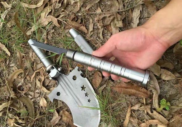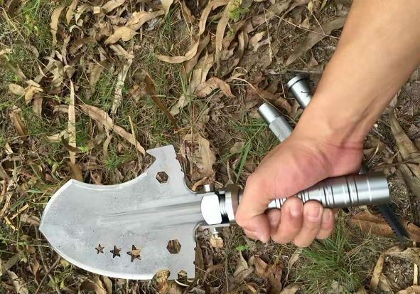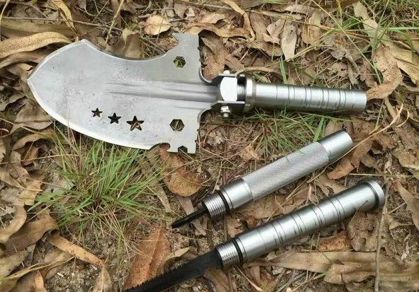 多功能五星工兵铲 全 长:680mm 刃 长:180mm 柄 长:500mm 刃 宽:125mm 刃 厚:2.6mm 刃 材:5Cr13Mov 重 量:1154g(含包装) 硬 度:57HRC 表 面:钛色 柄 材:钢柄 锁 型:多节 可拆卸 其 他:配件丰富,手工精巧,柄内配有多种生存附件: 螺丝刀,锯子,刀,撞针头等