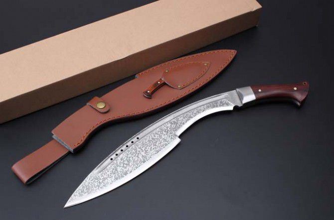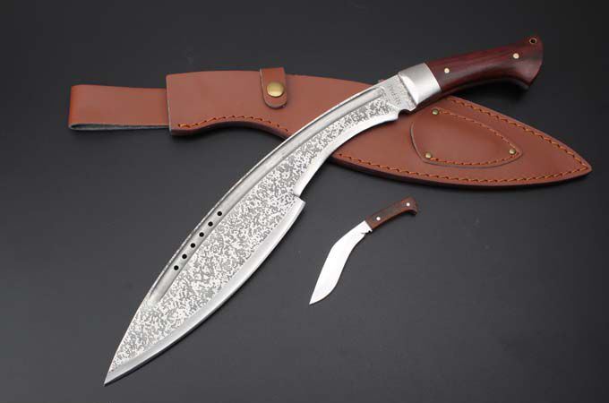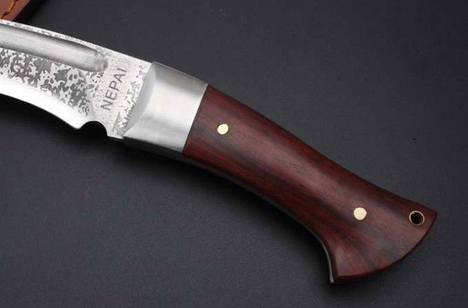 廓尔喀尼泊尔狗腿刀 全 长:50mm 刃 长:37mm 刃 宽:63mm 刃 厚:6mm 刃 材:优质9铬钢 重 量:1461g(含包装) 硬 度:59HRC 以上 表 面:沙光 柄 材:非洲黄檀木 其 他:配牛皮套+纸盒