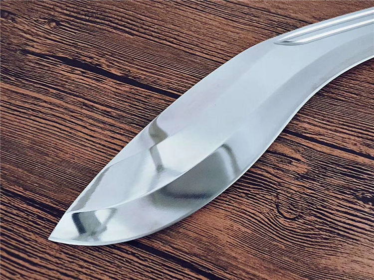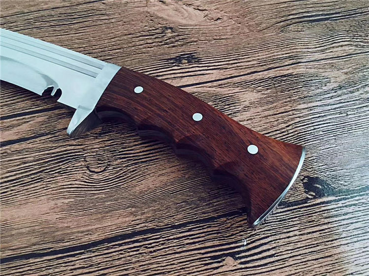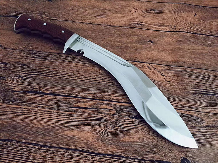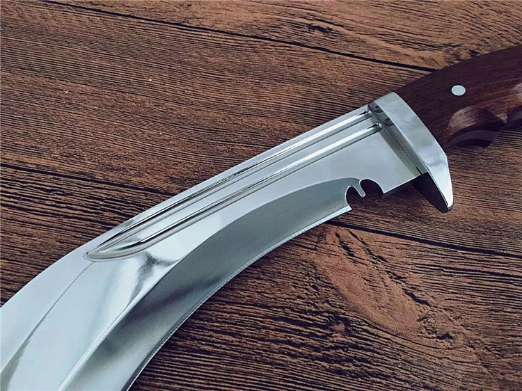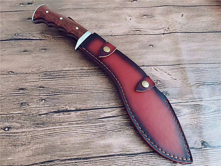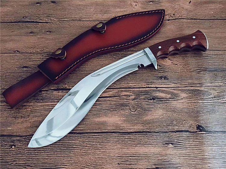 廓尔喀雷神尼泊尔狗腿刀 全 长:42CM 刃 宽:6.4CM 刃 厚:6MM 硬 度:59度 钢 材:9cr13 手 柄:钢头+进口酸枝木 表 面:超镜光 刀 鞘:手工真皮套