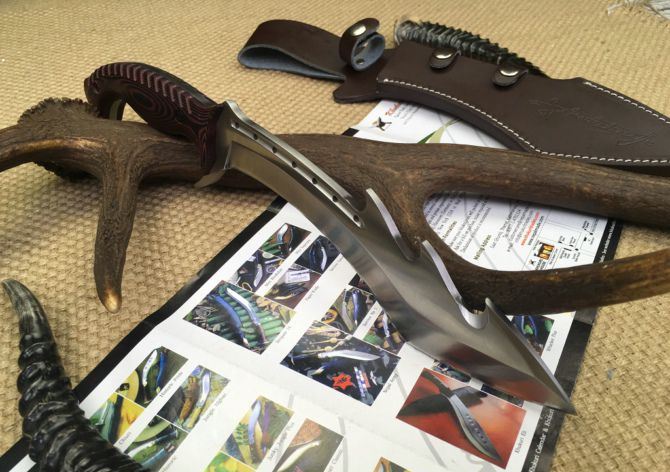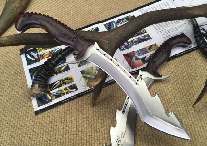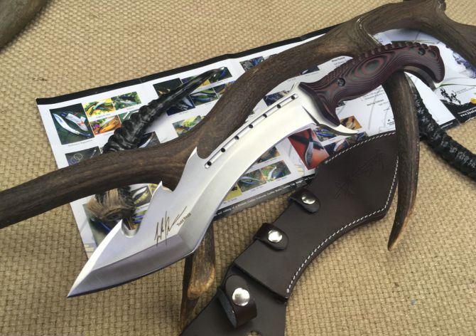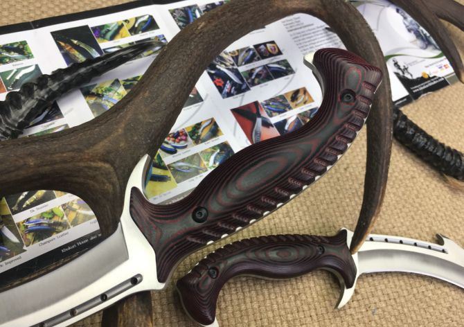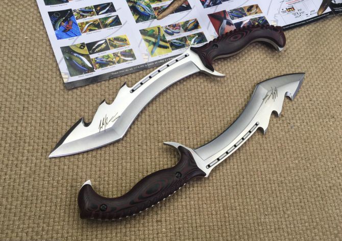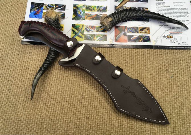 托德.贝格犀牛战士狗腿刀 全 长:385mm 刃 长:230mm 柄 长:145mm 刃 宽:55mm 刃 厚:6mm 刃 材:7Cr17Mov 重 量:780g(含包装) 硬 度:58-59HRC 表 面:砂光 柄 材:钢-体柄+米卡塔 锁 型:定锁 其 他:配皮套