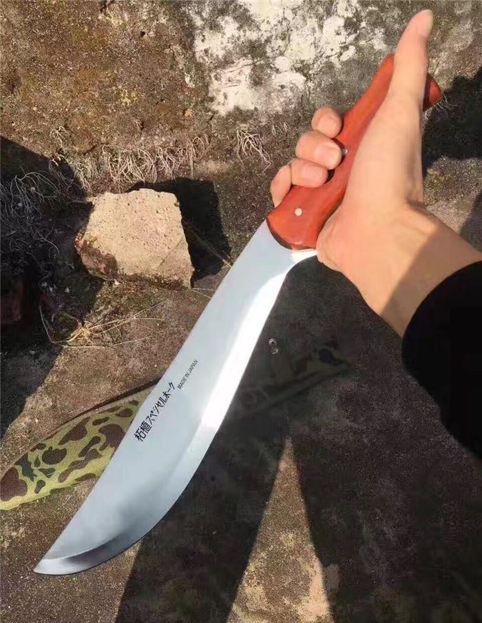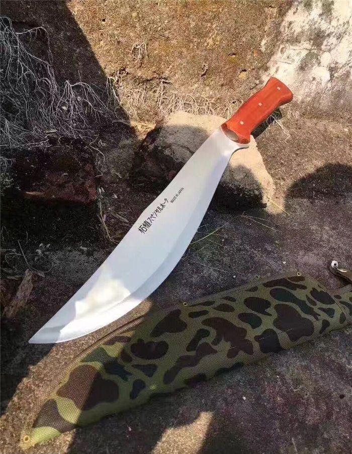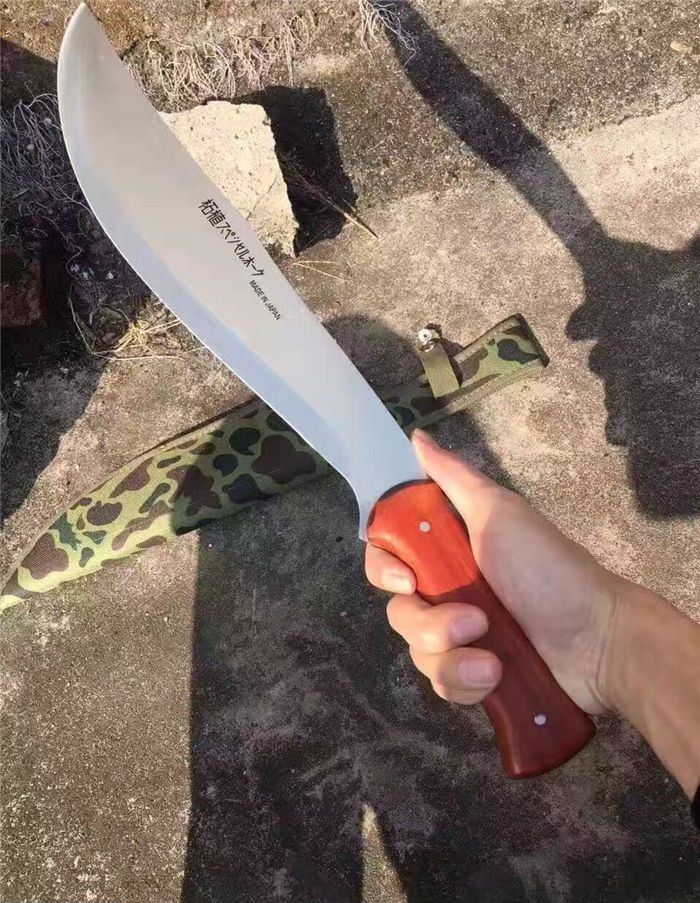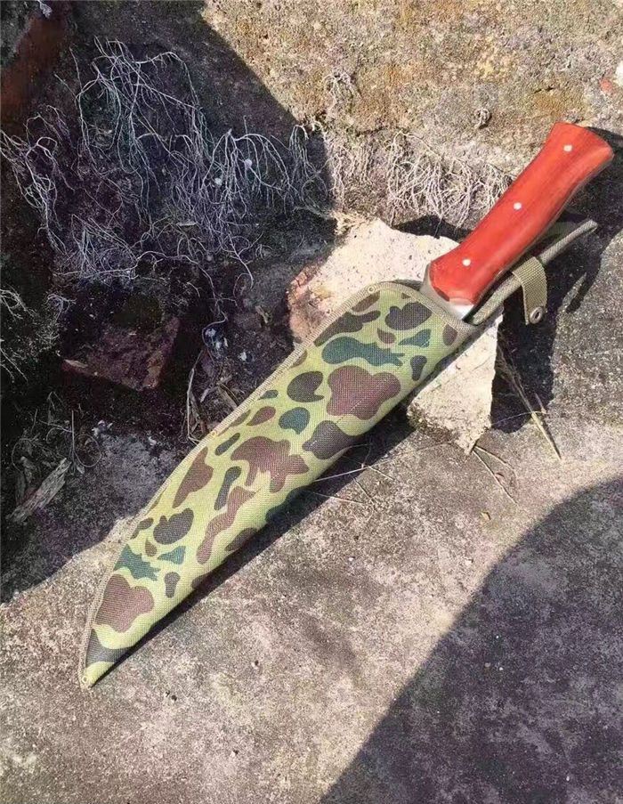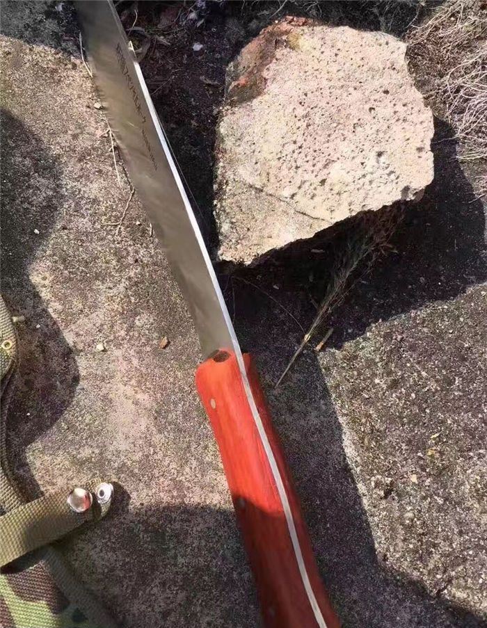 丛林作战弯刀 全长:48CM 刃长:34CM 刃宽:6.1CM 刃厚:0.3CM 硬度:54 刃材:440不锈钢 刀鞘:仿皮刀鞘 柄材:与刀刃整体成型,红木 净重:480克 特点: 这种形似狗腿的刀曾经装备过英国军队,此款是完全仿真版,刀身贯串刀柄,结实耐用,他的力量与用途的惊人结合,赋予了这把刀超凡的劈砍能力。象狗腿一样弯曲的刀刃,在砍劈时不似一般直线型或剑型开山刀一般手与刀刃在同一直线上,从而容易受伤;刀背呈一直线使你能正确的知道刀子运行的方向
