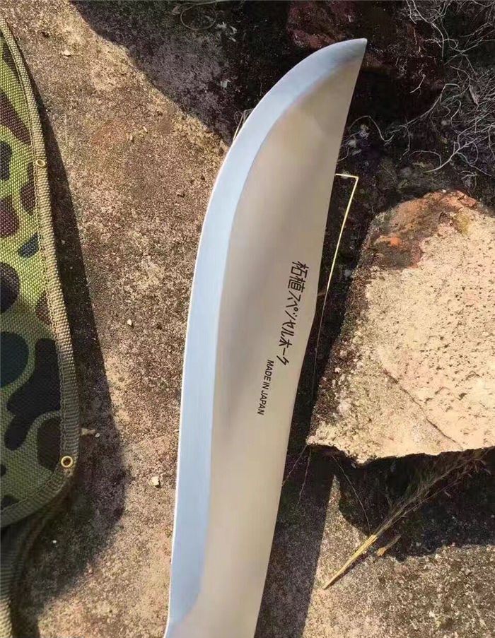 特点: 这种形似狗腿的刀曾经装备过英国军队,此款是完全仿真版,刀身贯串刀柄,结实耐用,他的力量与用途的惊人结合,赋予了这把刀超凡的劈砍能力。象狗腿一样弯曲的刀刃,在砍劈时不似一般直线型或剑型开山刀一般手与刀刃在同一直线上,从而容易受伤;刀背呈一直线使你能正确的知道刀子运行的方向