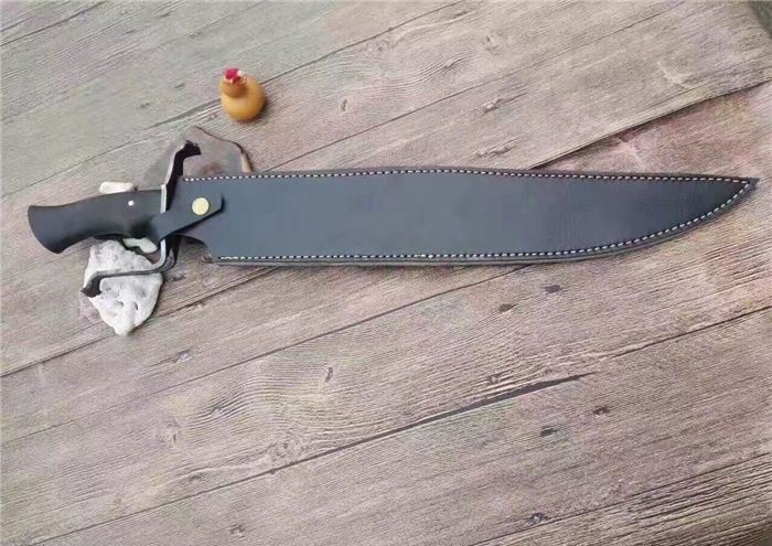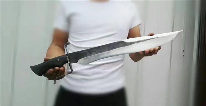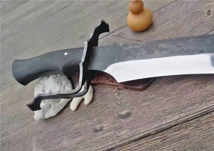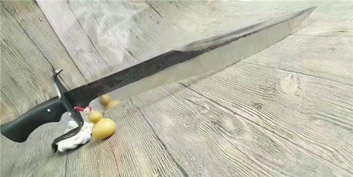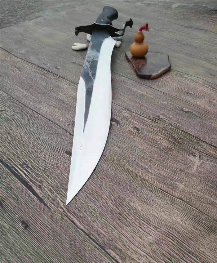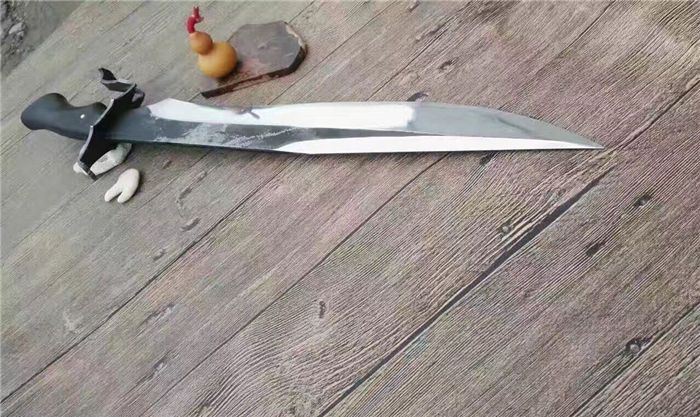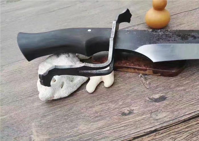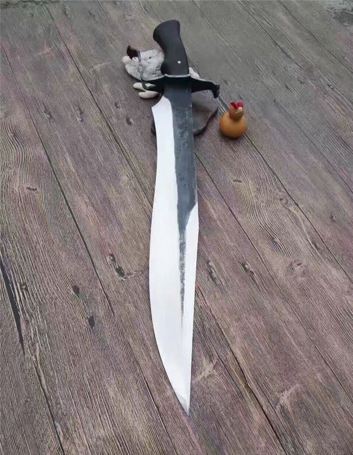 独家新款纯手工大博弈战斗刀 总长:56 刃长:43 柄长:13 宽:4.2 厚:0.5 材质:65锰钢 超高硬度 柄:印尼紫光檀 素铁护手 独家设计 大博弈设计极具搏斗性和攻击性,是极度强劲的野外生存刀具和战斗刀具全龙骨柄芯贯穿整个手柄,有着更舒服稳固的把握度