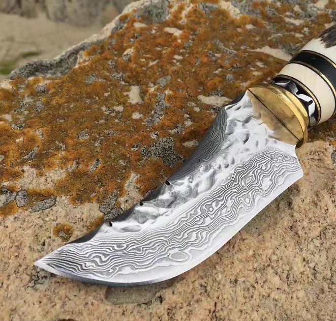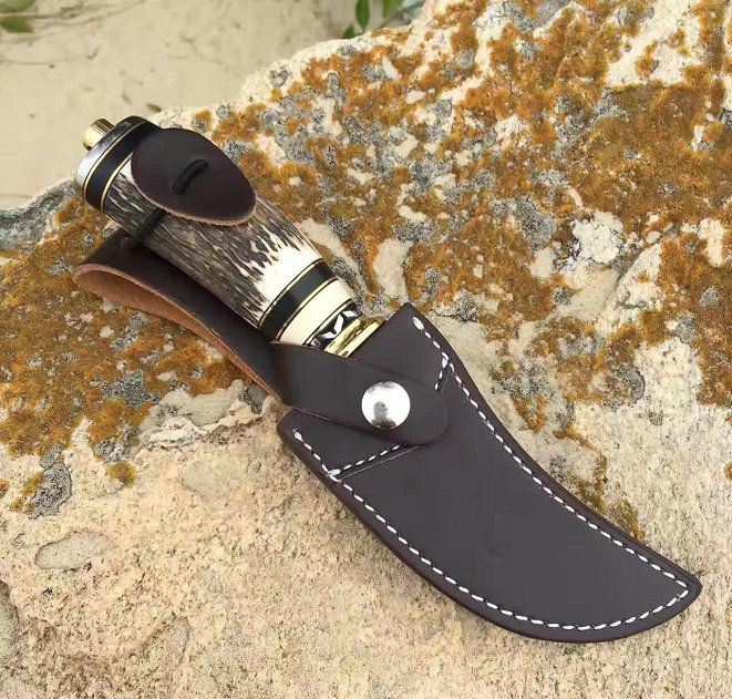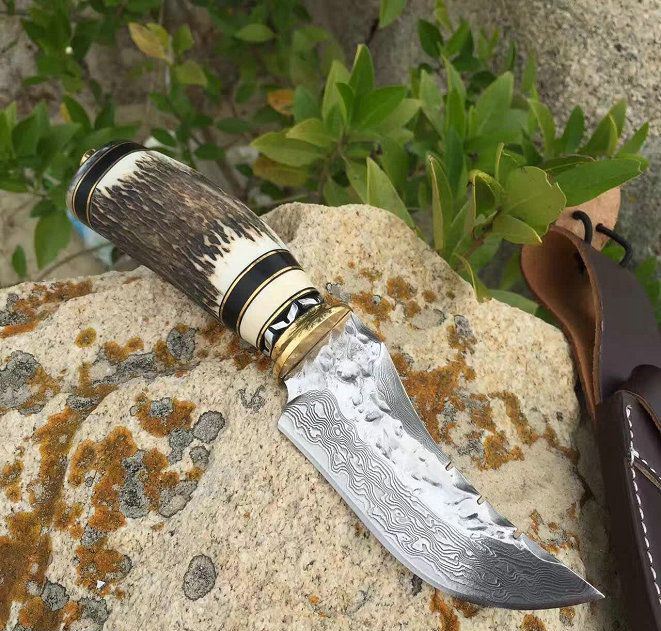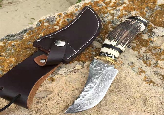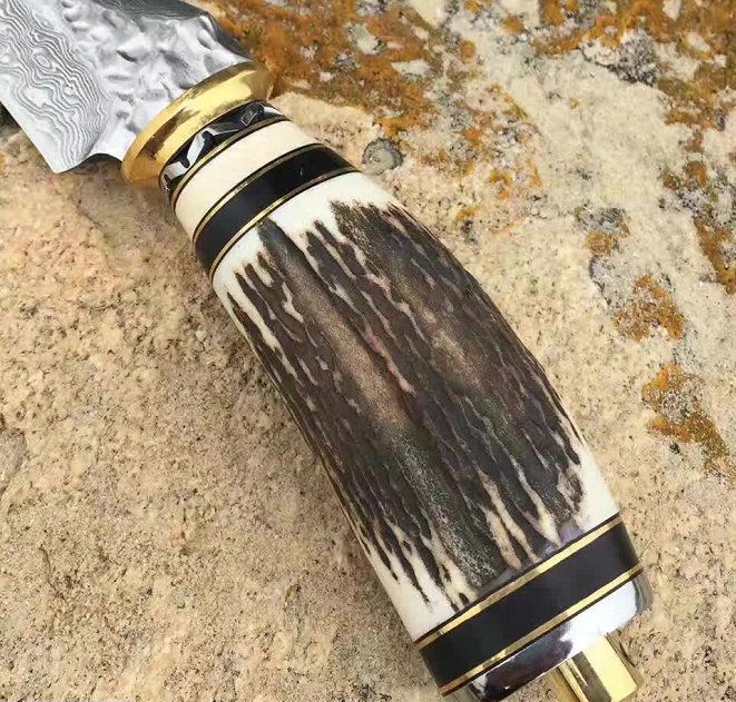西角大马士革直刀 全长:22cm 刃长:10.5cm 刃厚:4mm 柄长:12cm 柄材:黄铜+黑牛角+天然鹿角 刀刃:大马士革钢 硬度:59HRC 全程手工打磨制造、刀刃锋利、配牛皮刀套