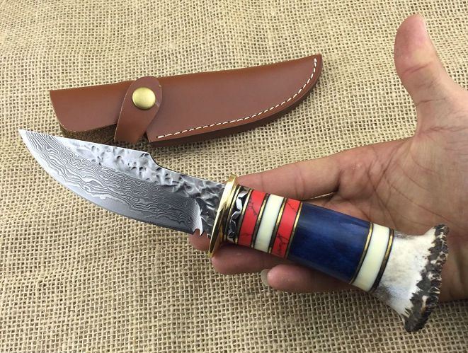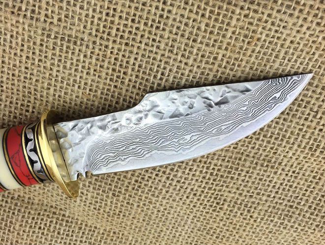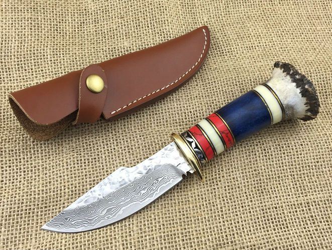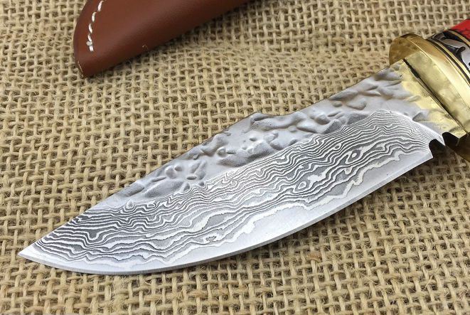 尾部鹿角材料难得、做工精细到位、每一把都是精品中精品......配--高档原装皮套+精美礼品盒子、刀刃锻打祥云花纹原色,嵌黄铜丝层层精打细磨,黄铜护手+镶天然精选鹿角作手柄,整刀设计新颖独特威武而霸气,极其锋利!把玩级藏品