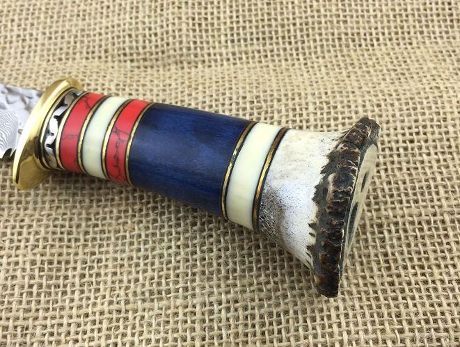 柄 材: 纯黄铜护手+彩石+蓝牛骨+尾部精挑鹿角头部