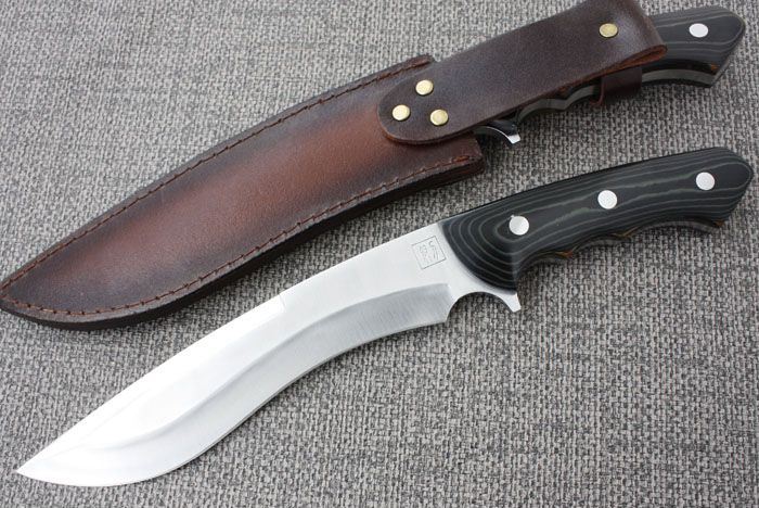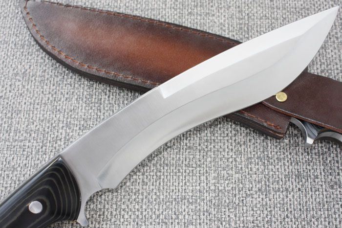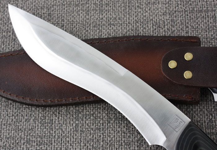 刀奴系列之神龙弯刀 全长:39cm 刃长:23cm 刃厚:0.68cm 刃材: 440钢 硬度: 57HRC 表面:丝光 重量:880克 刀柄:米卡塔 刀鞘:牛皮