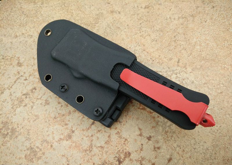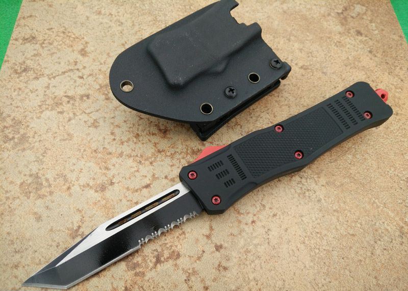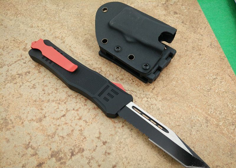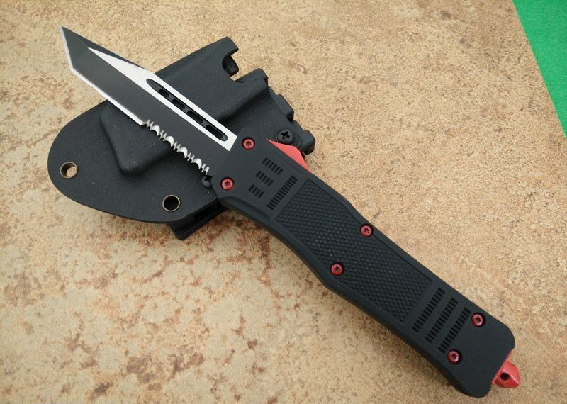 微技术红魔色A161直跳刀单锋半齿 全 长:24.0cm 刃 长:9.0cm 柄 长: 14.5cm 刃 宽:1.9cm(最宽处) 刃 厚:2.9mm 刃 材:440C 硬 度:56HRC 刀 柄:防滑纹铝合金柄,外表橡胶包裹,尾端玻璃击破器 表 面:发黑 锁 定:自动锁定装置 重 量:440克(包括:说明书、尼龙刀套和包装盒) 备 注:带坚固背夹 魔色系列 补充说明:直出弹簧刀的点头现象得到了很好的控制,出刀轻而快!手感好