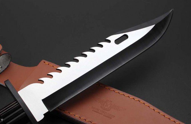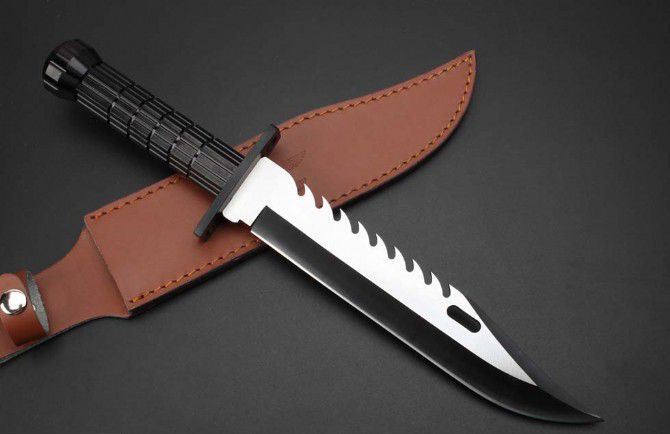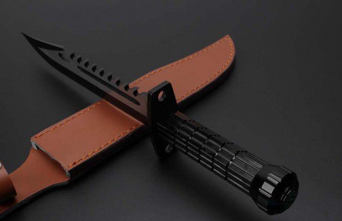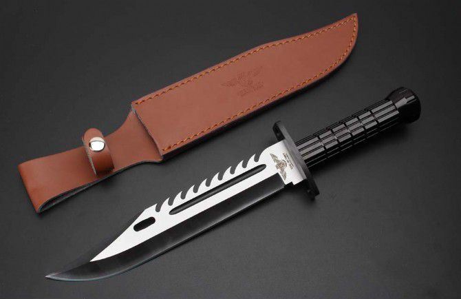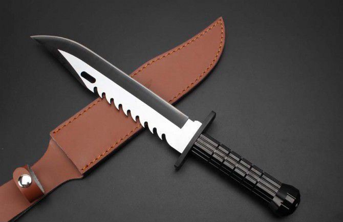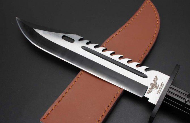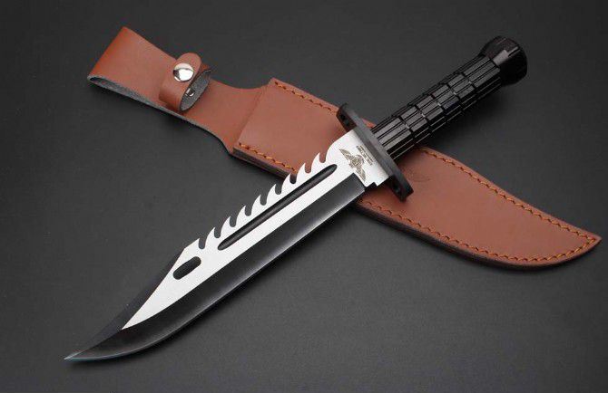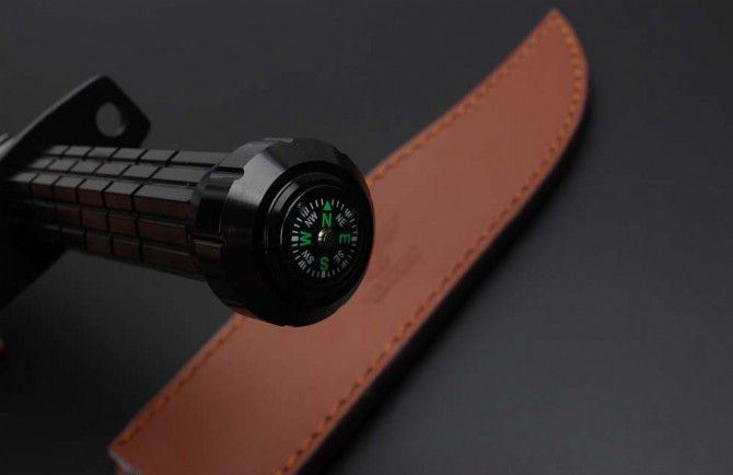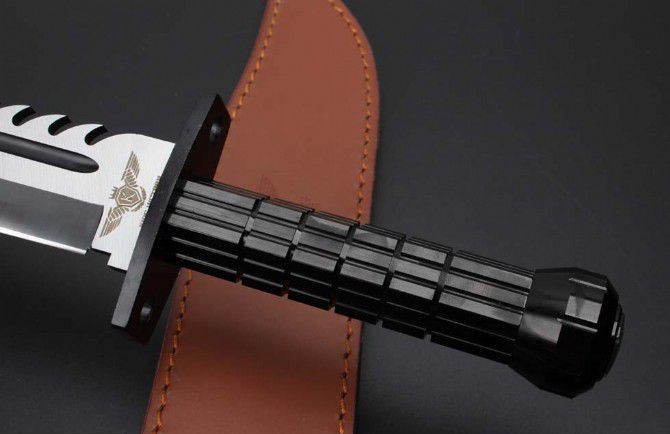 战魂猎鹰军刀带打火石 全 长:40.0cm 刃 长:25.5cm 柄 长:14.1cm 刃 厚:5.2mm 刃 宽:3.3cm 刃 材:7Cr13Wov 表 面:刃口黑钛+拉丝 柄 材:合金铝柄 硬 度:57HRC 净 重:642g(含皮套) 重 量:748克(含包装物)