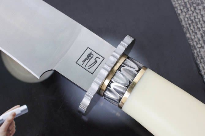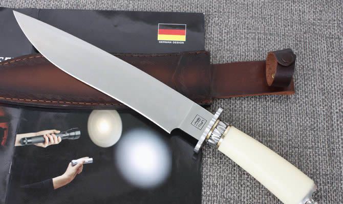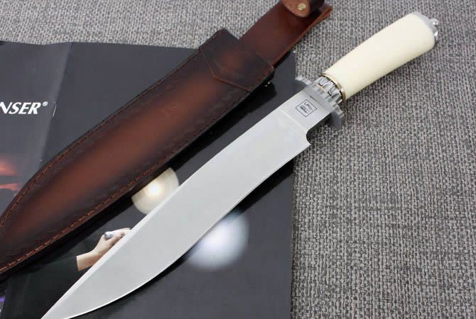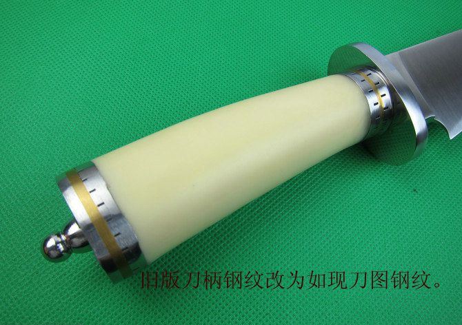 刀奴手工系列雪月刀 全 长: 42.5cm 刃 长: 28.5cm 刃 厚: 8mm (超厚) 刃 宽: 4.5cm (最宽处) 刃 材: 4Cr14Mov高级不锈钢 硬 度: 58HRC 重 量: 750g(含套) 表 面: 丝光 柄 材: 仿玉树脂 刀 鞘: 真皮压花刀套 品 质: 高品质
