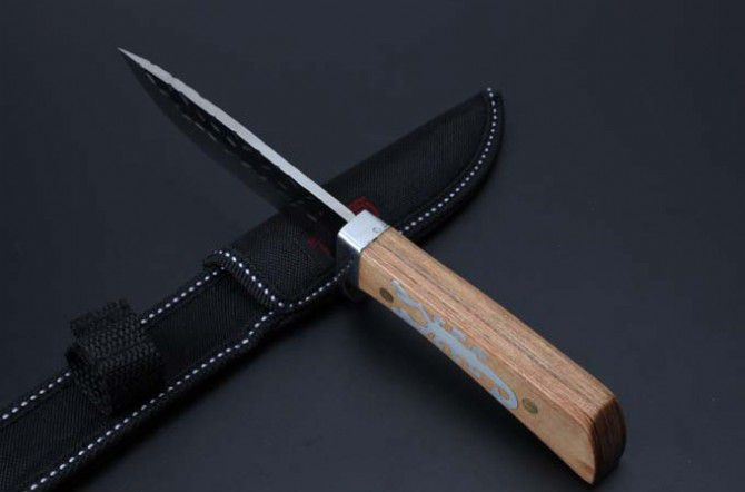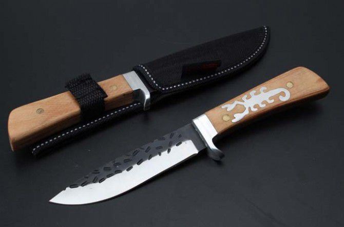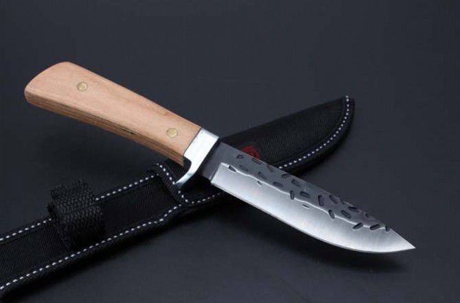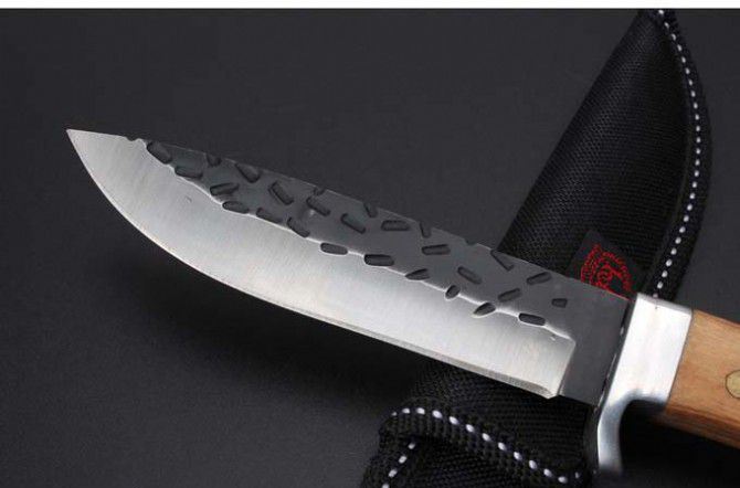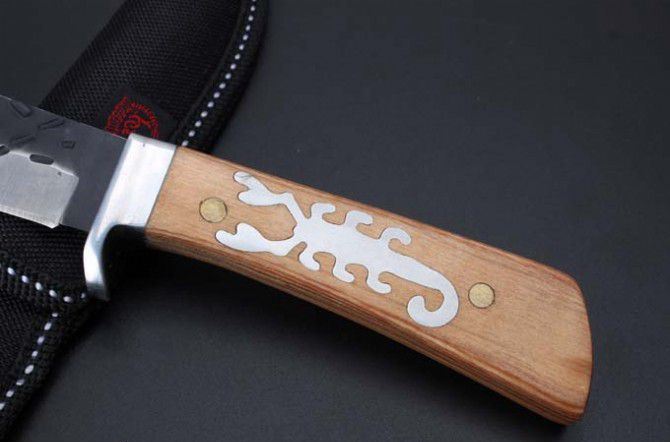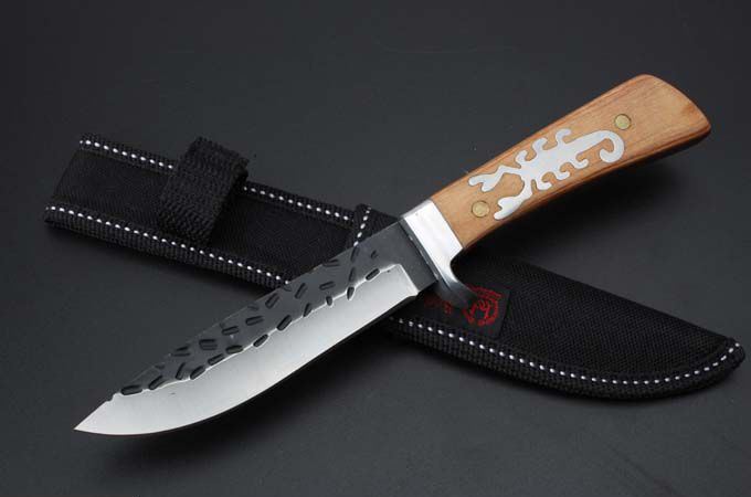 蝎子锻打小猎刀 全 长: 22.1cm 刃 长: 11.5cm 刃 厚: 4mm 刃 材: 锻炼弹簧钢 硬 度: 58HRC 重 量: 141kg 表 面: 氧化黑 柄 材: 坚木 刀 鞘: 尼龙