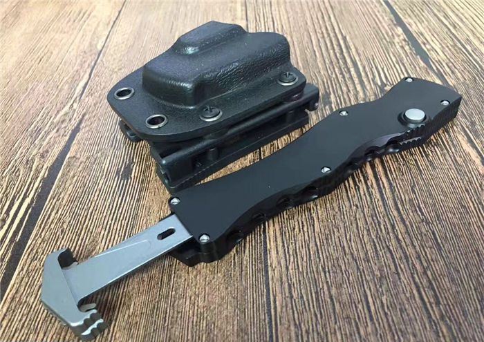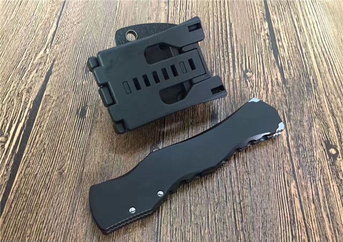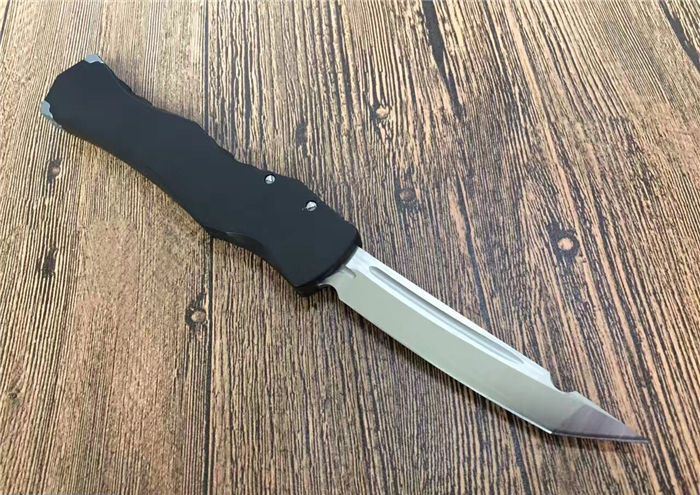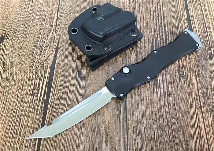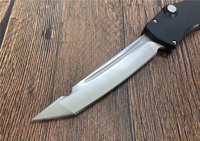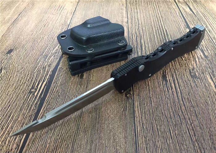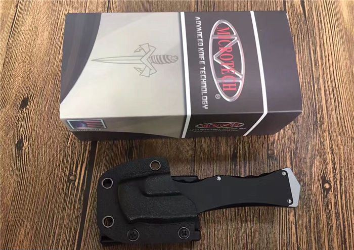 微技术炫光4黑色柄T头跳刀 全长:23.5 CM 刃长:9.8 CM 刃宽:1.7 CM 刃厚:0.32 CM 刀刃材质:D2 柄材:铝合金 刀型:直跳 锁定类型:按钮锁 重量:188克(含包装) 附件:Kydex鞘,刀油布,彩盒 整刀用CNC,电脑锣,线切割制作而成,手工,精密度非常高