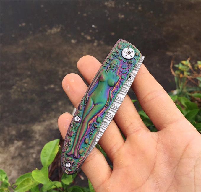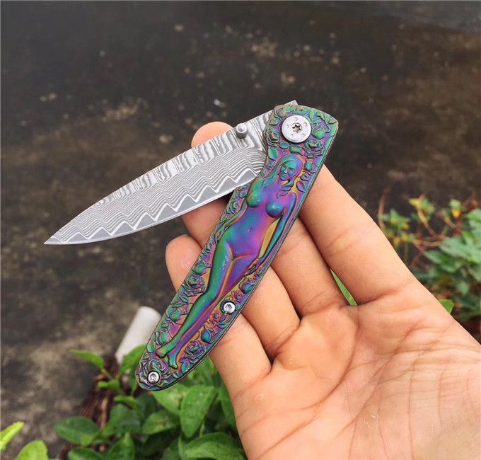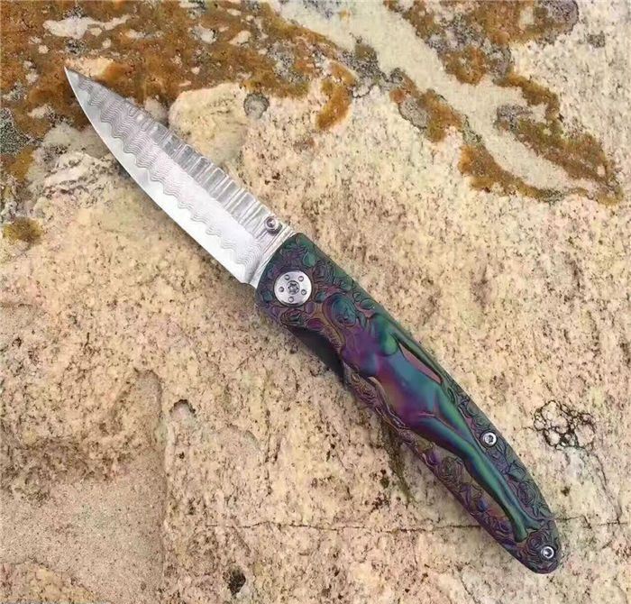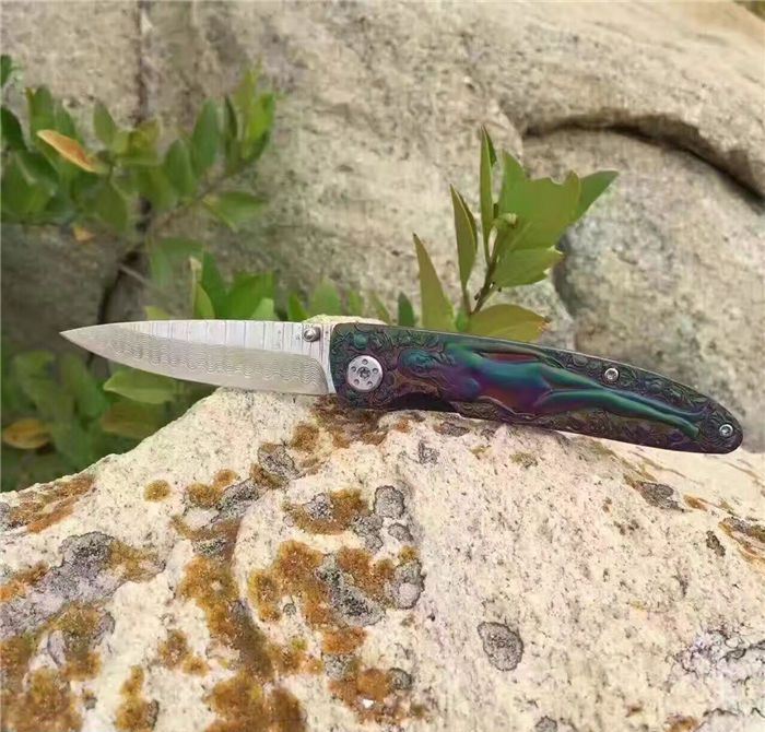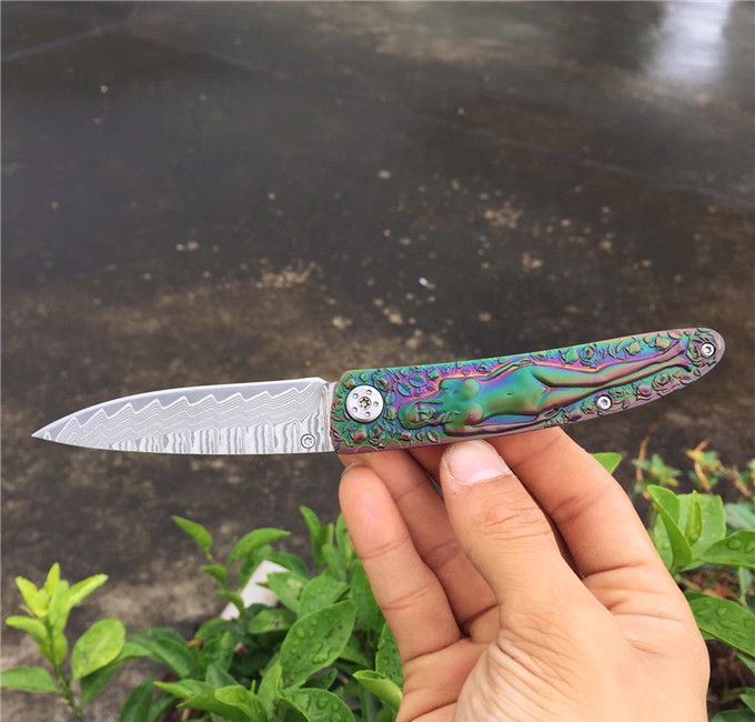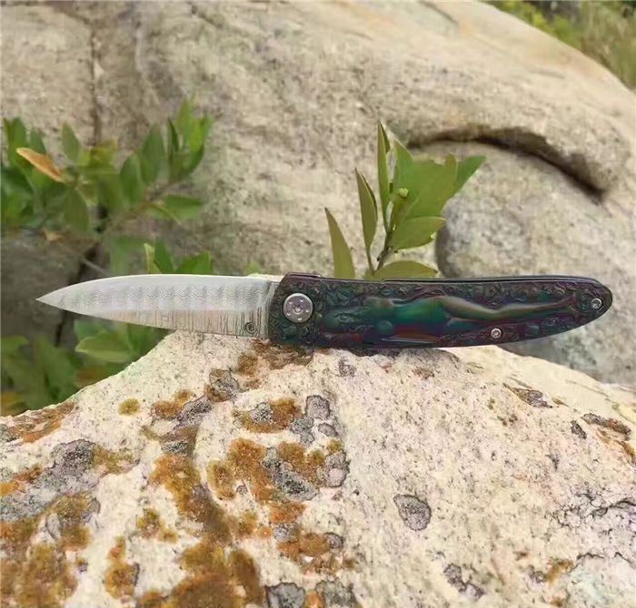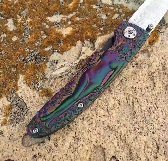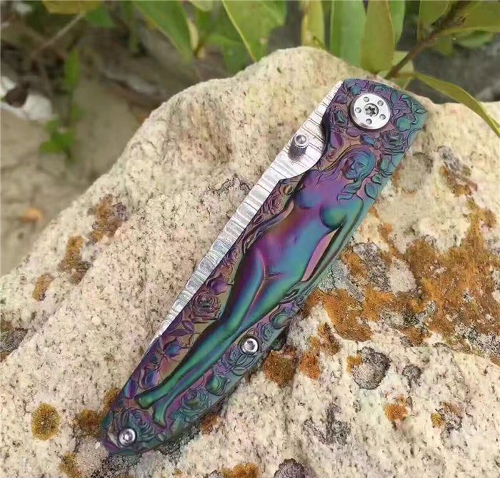 高档大马士革裸女折刀 刀刃钢材:大马士革钢vg10 手柄材料:全钢雕刻 整刀全长:19cm 刃长:8cm 折合长:11cm 刀刃厚度:3mm 硬度:59HRC 大马士革折叠刀、手柄裸女雕刻镀彩,精致做工高档小刀、刃口锋利可刮胡子
