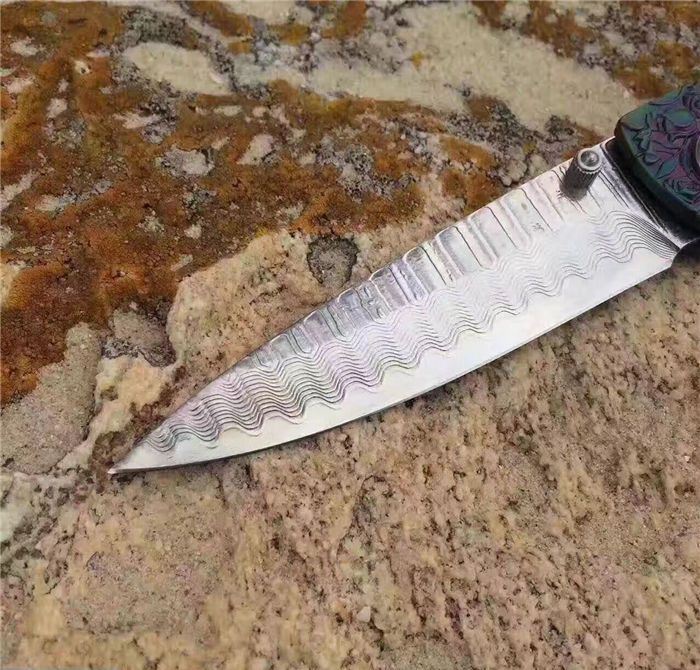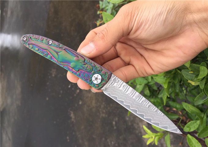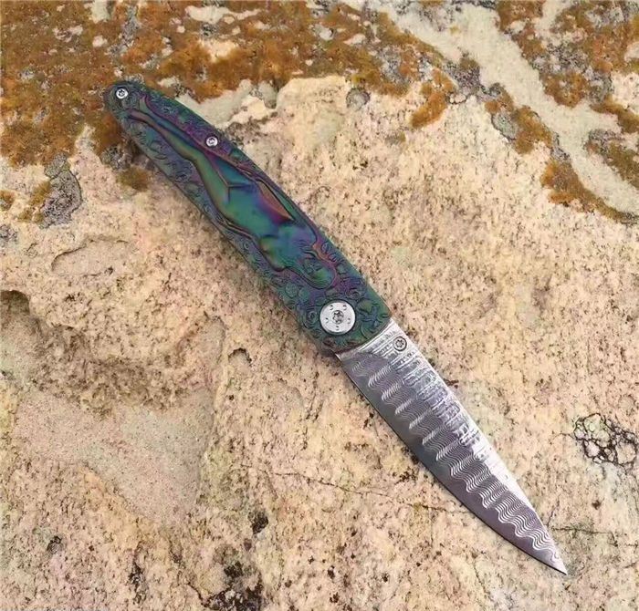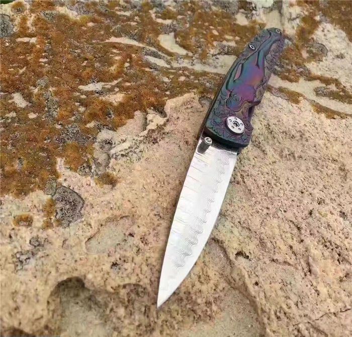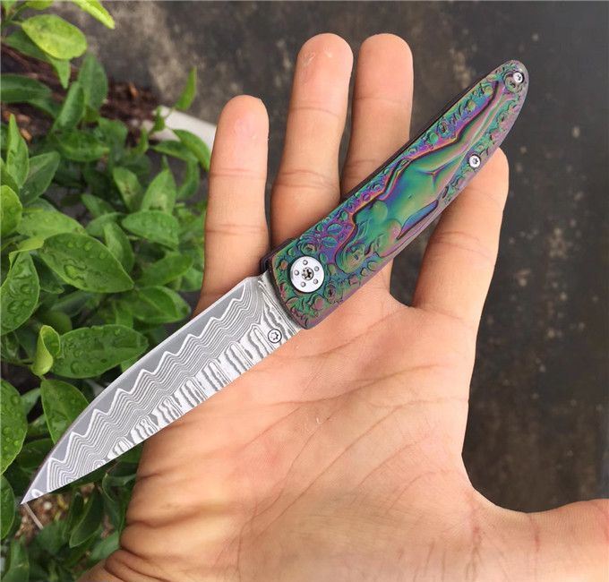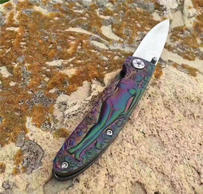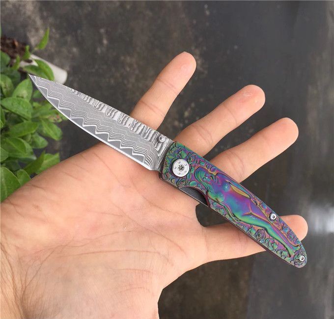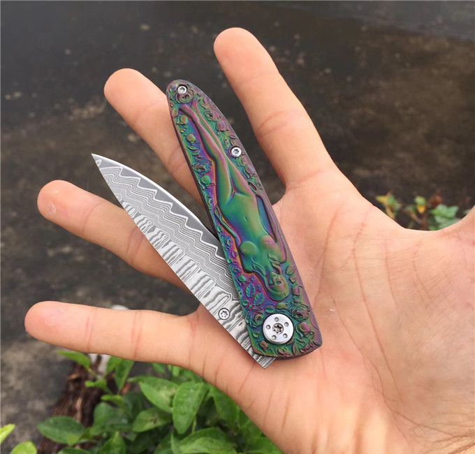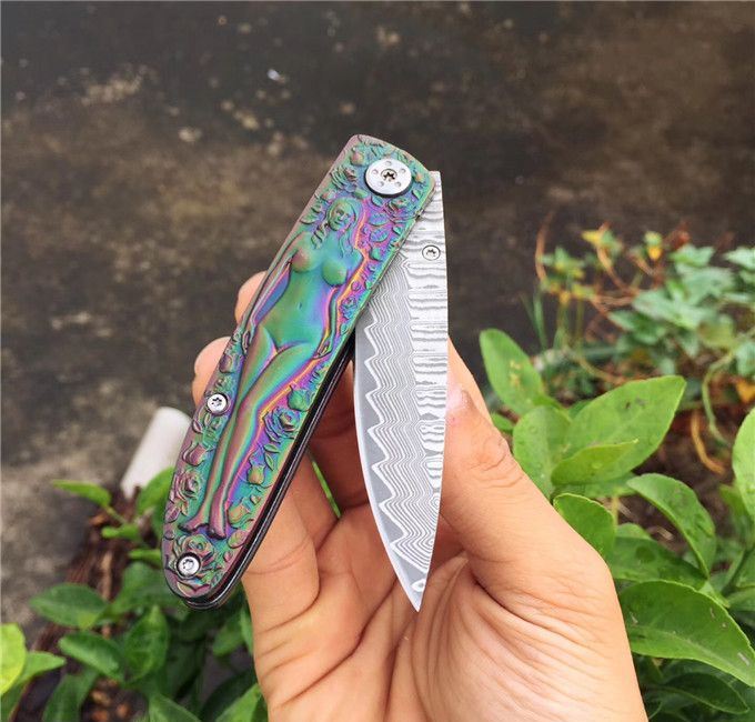 高档大马士革裸女折刀 刀刃钢材:大马士革钢vg10 手柄材料:全钢雕刻 整刀全长:19cm 刃长:8cm 折合长:11cm 刀刃厚度:3mm 硬度:59HRC 大马士革折叠刀、手柄裸女雕刻镀彩,精致做工高档小刀、刃口锋利可刮胡子