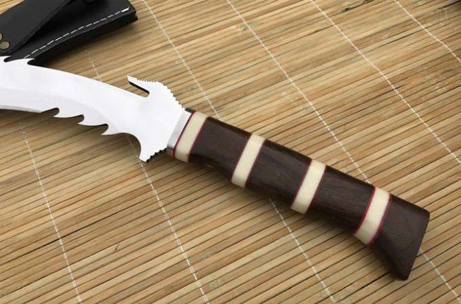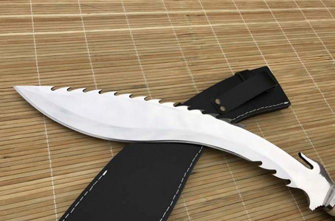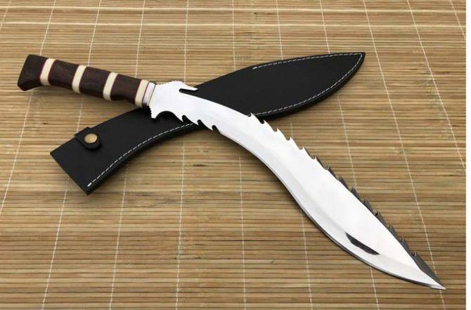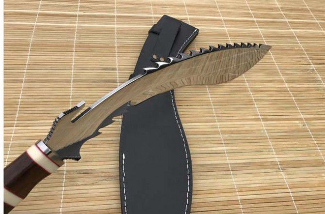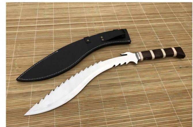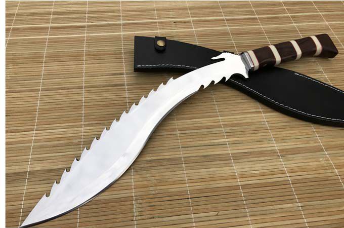 生化女王超镜光狗腿刀 全 长: 58.1cm 刃 长: 39.8cm 柄 长: 17.2cm 刃 厚: 5.1mm 刃 宽: 6.5cm(最宽处) 刃 材: 420 硬 度: 57HRC 刀 重: 1412克(含包装) 表 面: 超镜光 柄 材: 钢+檀木 结 构: 一体龙骨 刀 鞘: 牛皮套 +纸盒
