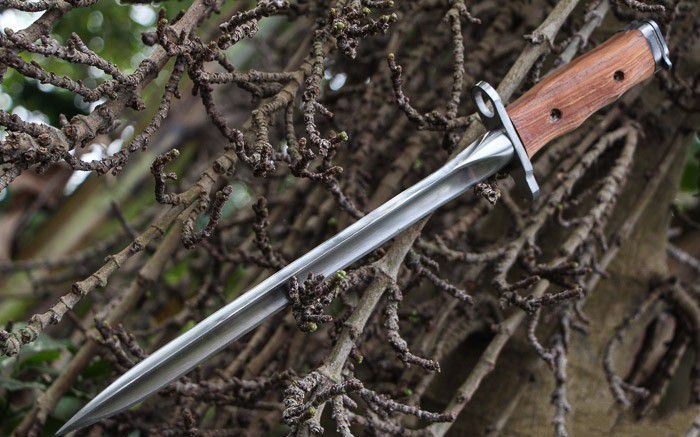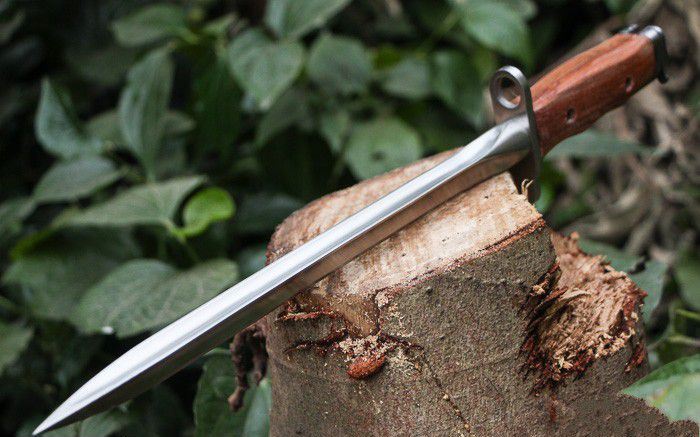 三棱军刺大号(钢本色) 长 度:40CM 刃 长:28.5CM 刀直径:2.1CM 净 重: 450g 硬 度: 56HRC 刀材质:430高碳不锈钢 柄 材:原木 附皮革刀套。
