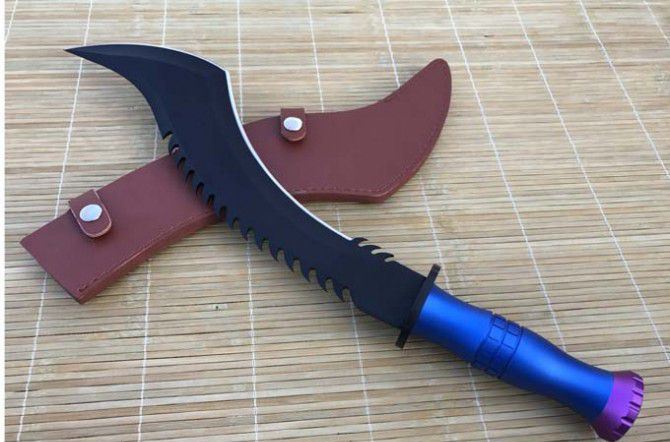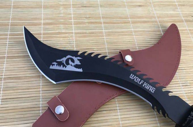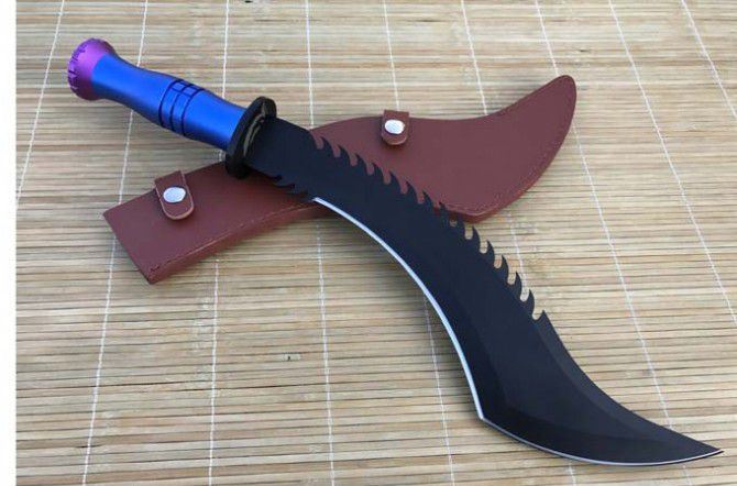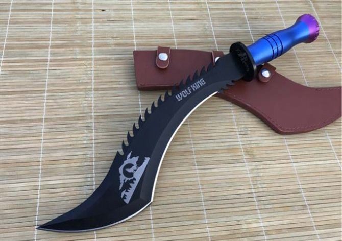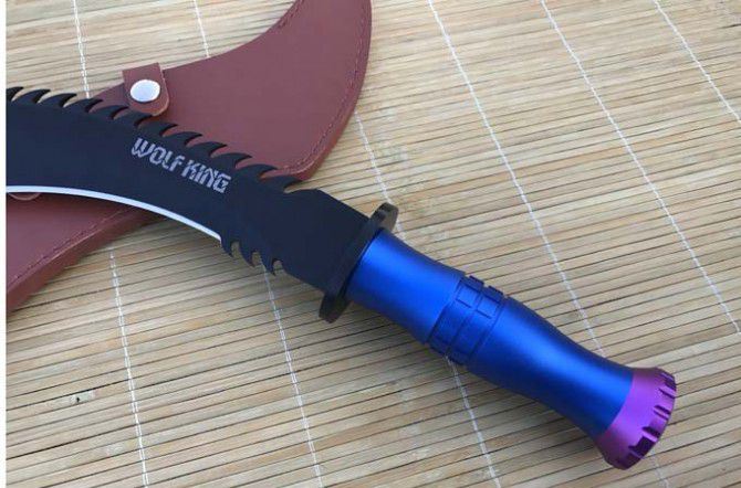 印度犀牛黑钛版狗腿刀 全 长:493mm 刃 长:350mm 柄 长:140mm 刃 宽:75mm最宽处 刃 厚:5mm 刃 材:9cr18mov 重 量:1776g(含包装) 硬 度:59HRC 表 面:黑钛 柄 材:一体钢+铝柄