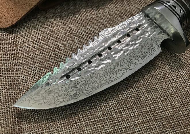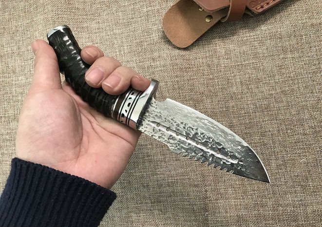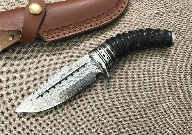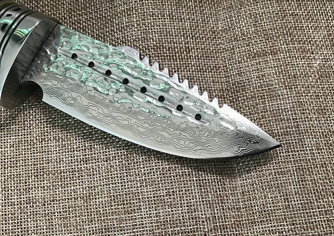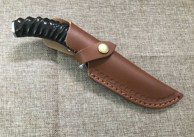 重磅推出雪花纹大马士革黑羊角猎刀,一把不可错过的收藏级猎刀,用料更是毫不吝啬,真材实料!此款刀刃是用4.2mm的雪花纹大马士革手工打造完工刃厚4.0+mm!刀刃首次镶黄铜手工雕刻火星坑,凸显尊贵不凡!柄材选用的是世上稀有的蒙古野生羊角