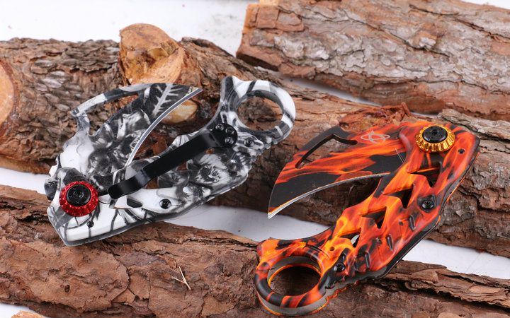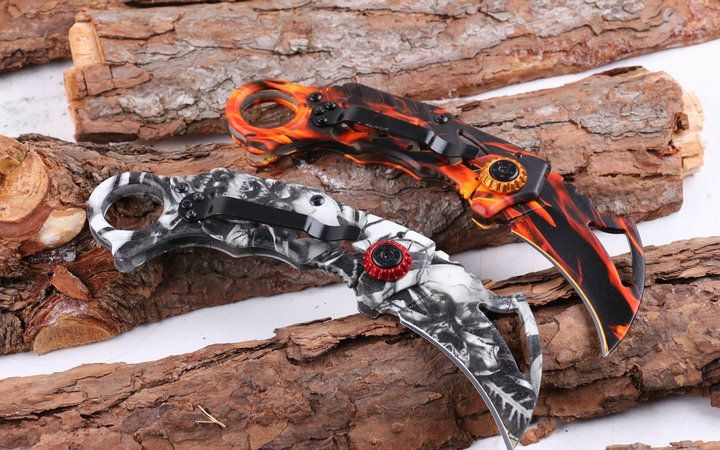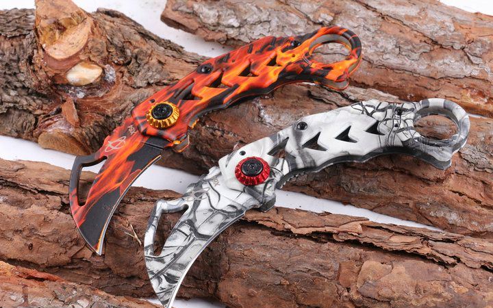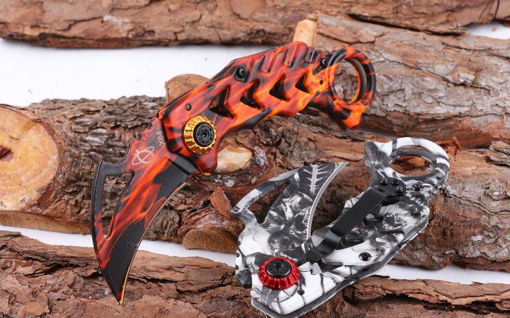 X64两色爪刀 全长:16.5cm 刃长:6.6cm 柄长:11.8cm 刃厚:0.3cm 刃宽:3.2cm 刃材:5CR15MOV 柄材:全钢头 硬度:57HRC 净重:150克(含包装) 锁定:线锁 表面处:红火焰+黑白两色,下单注明 其他:原厂彩盒