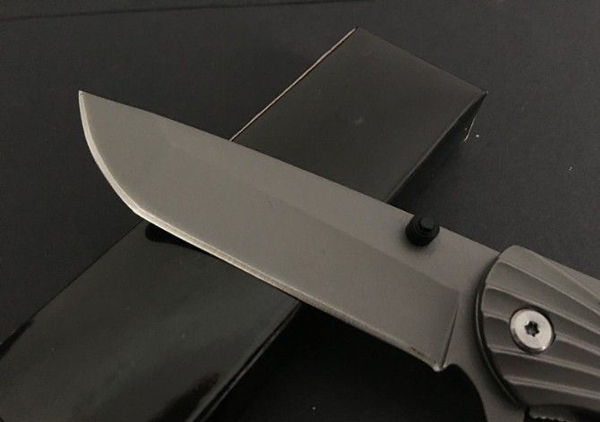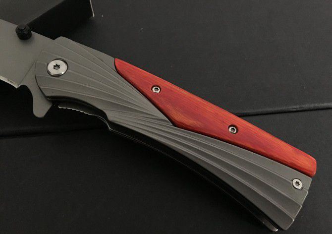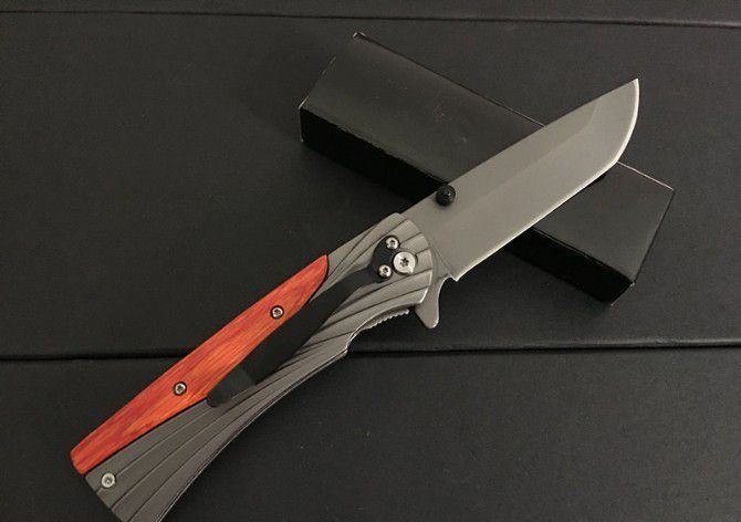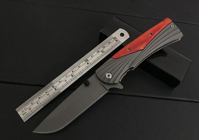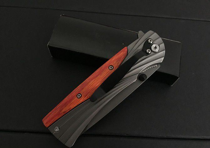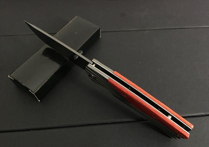 啄木鸟B026折刀 全长:21.5cm 刃长:9.2cm 柄长:12.3cm 刃厚:0.4cm 刃宽:3.5cm 刃材:5CR15MOV 柄材:全钢+酸枝木 硬度:56HRC 净重:228克 锁定:线锁 表面:镀钛 其他:原厂黑盒