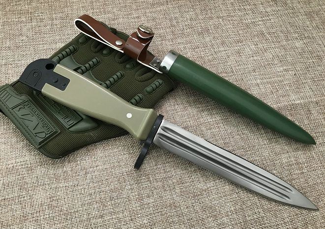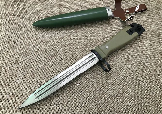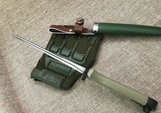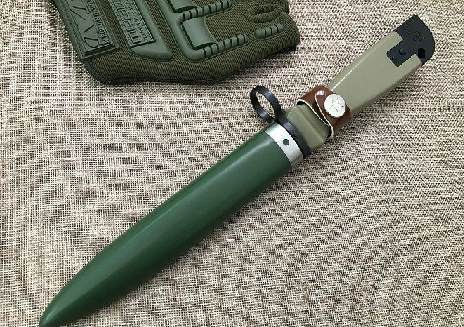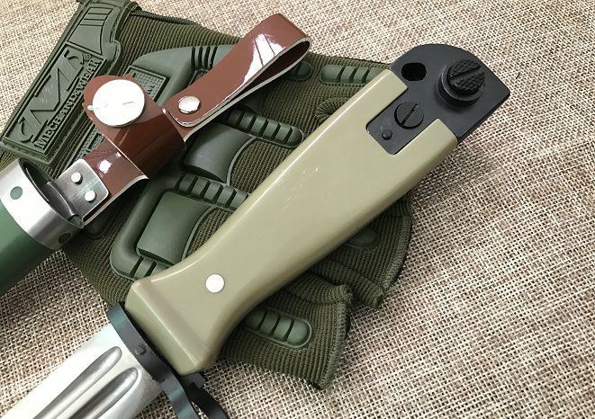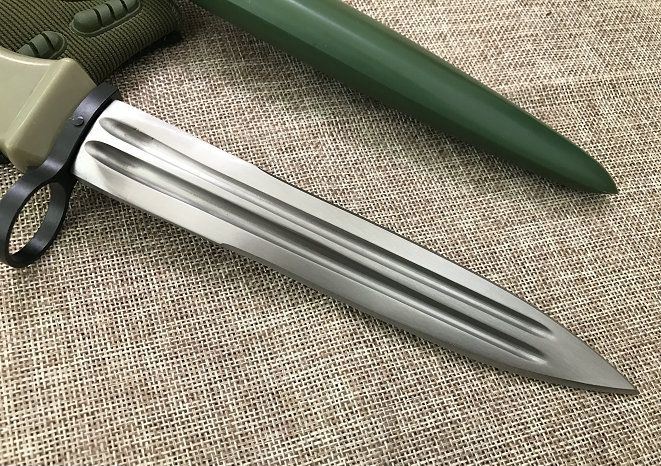 八一军刺沙漠色柄 全长:29.8cm 柄长:12.8cm 刃长:17cm 刃宽:2.3cm 刃厚:12mm 硬度:60HRC 表面:沧桑石洗 刃材:军用钵(合金钢) 鞘材:军用ABS 柄材:ABS+钢 总重:320g