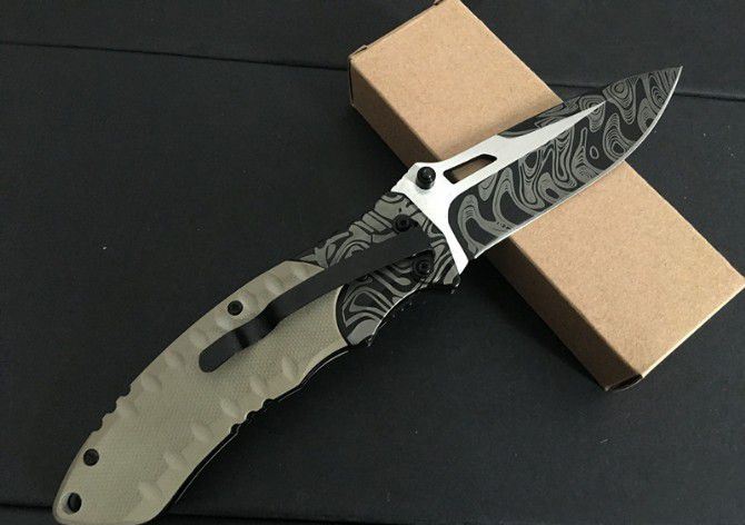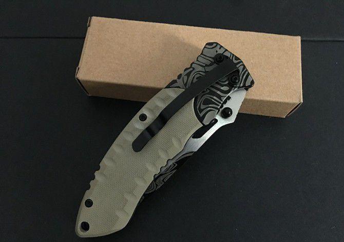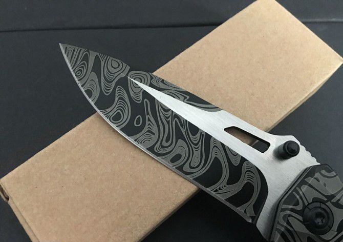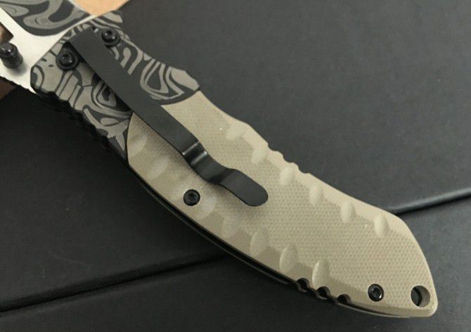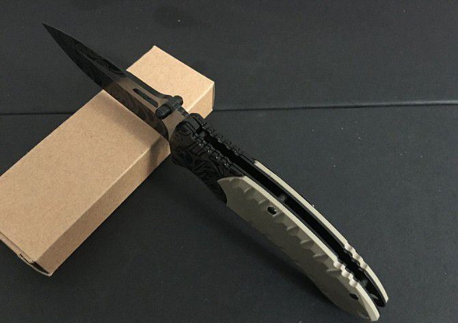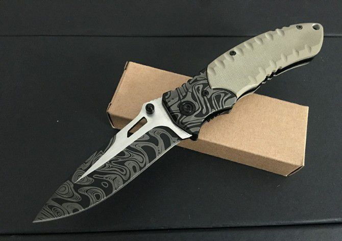 F93沙漠飞鸟花纹折刀 全长:20.3cm 刃长:8.3cm 柄长:11.5cm 刃厚:0.3cm 刃宽:3.0cm 刃材:5CR15MOV 柄材:钢片+防滑G10 硬度:57HRC 净重:130克(含包装) 锁定:线锁 表面处:花纹 其他:原厂啡盒