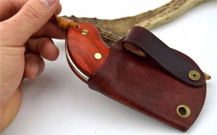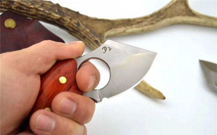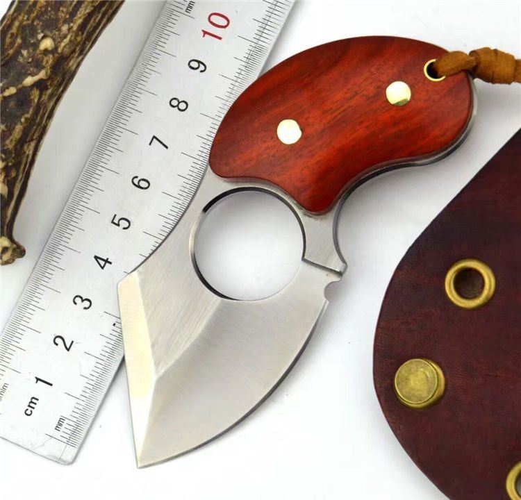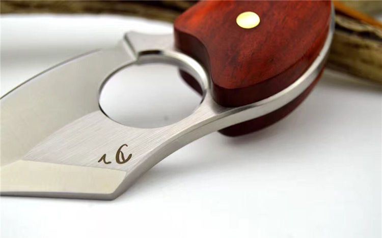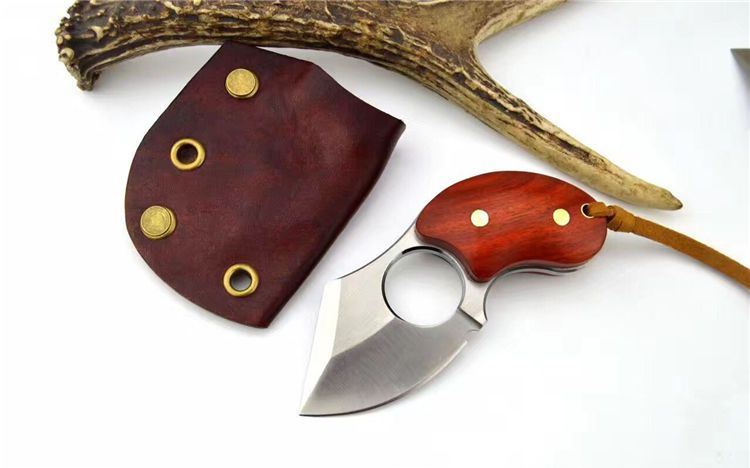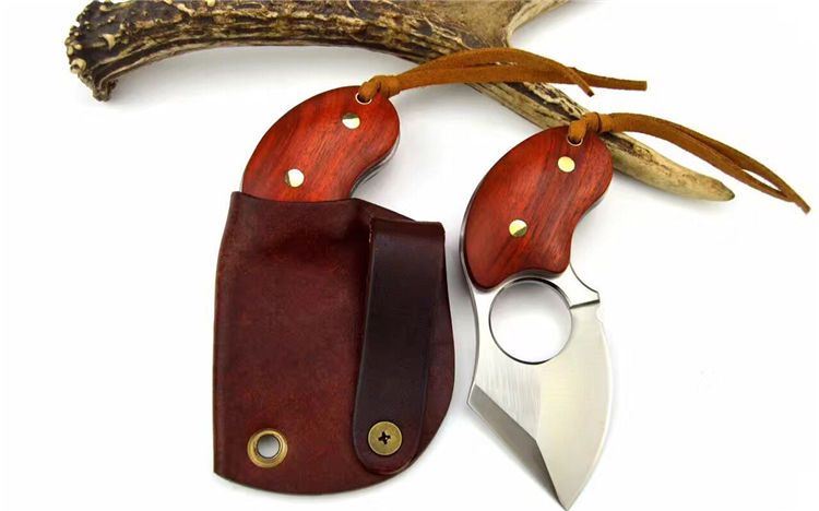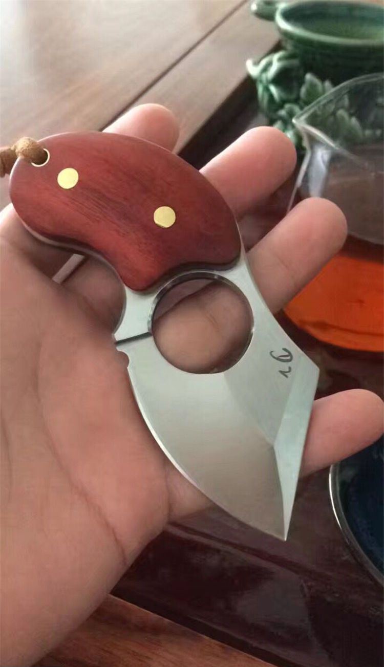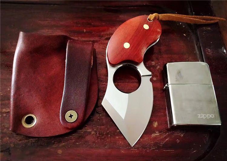 异形肥仔手刺d2钢 全长:11.5cm 刃长:5.5cm 刃厚:4.8mm 刃材:d2钢 硬度:60 表面处理:拉丝 纯铜铆钉固定两边科檀木