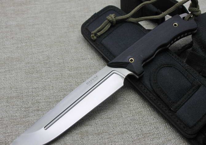 山猪冒险者直刀 全 长: 30cm 刃 长: 16cm 柄 长: 14 刃 材: 7CR13MOV 硬 度: 58 表 面: 砂光 刃 厚: 0.37cm 柄 材: G10柄 刀 重:360克 总 重: 650克 刀 鞘: 尼龙套