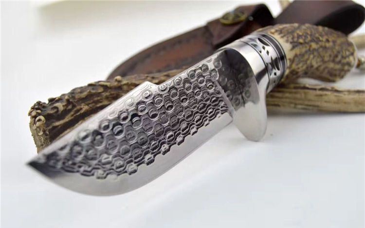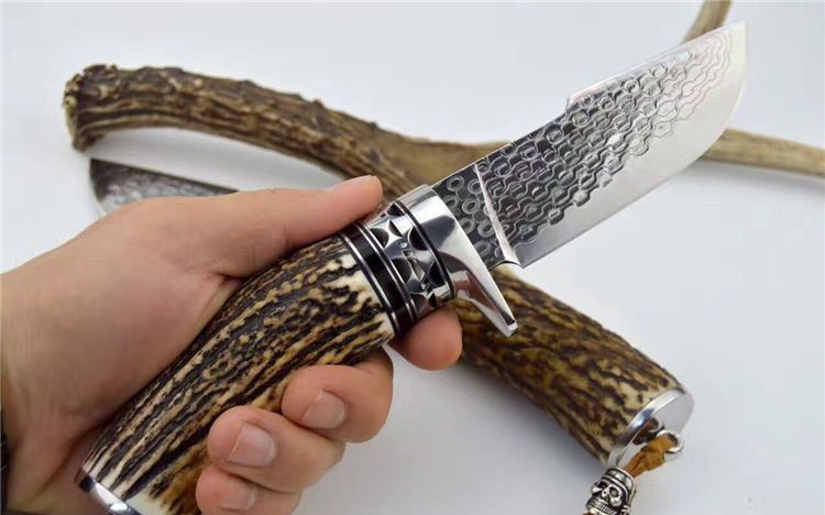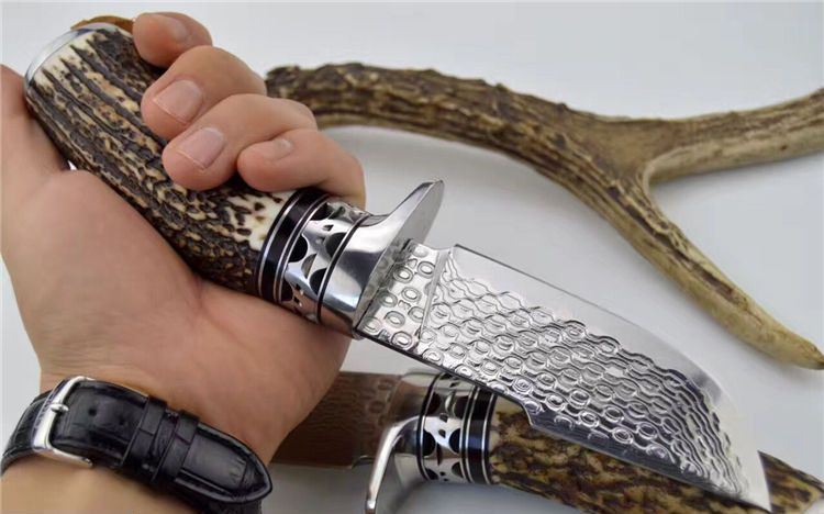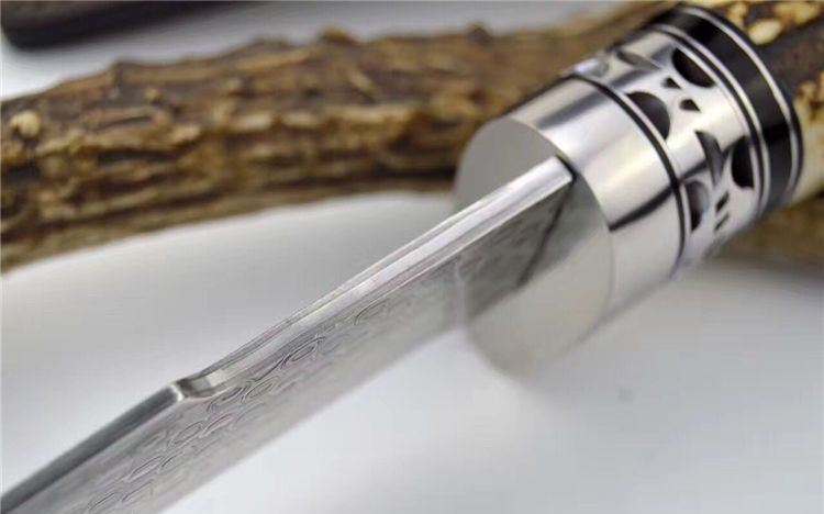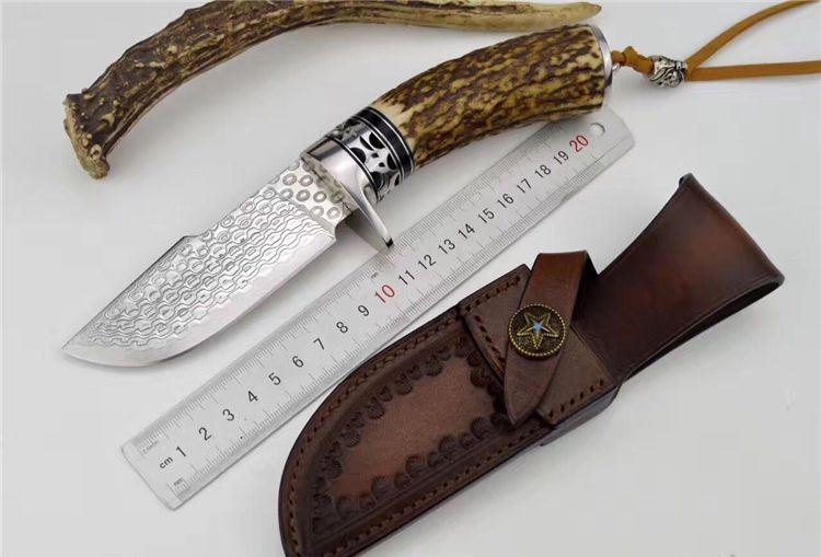 鹿角风暴大马士革直刀 总长:23cm 刃长: 9.8cm 刃宽: 3.6cm 刃厚: 0.39cm 包装:手工制作头层牛皮套+礼盒 每条鹿角都亲自精挑细选出的粗段鹿角。夹钢大马,雨点纹。不锈钢护手,海盗骷髅头吊坠。配备手工头层牛皮套