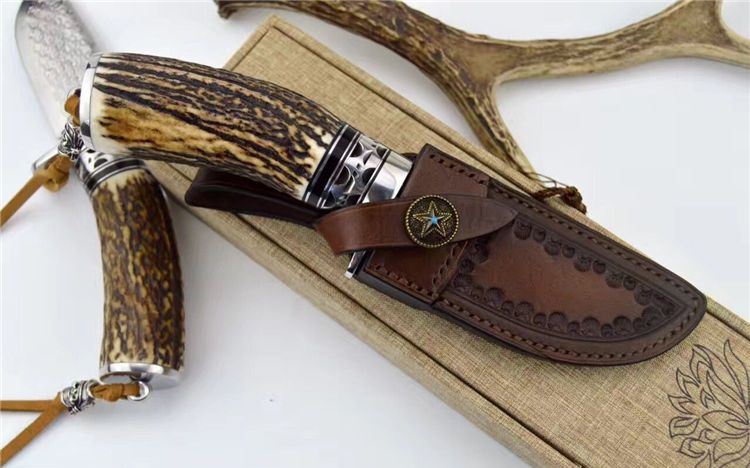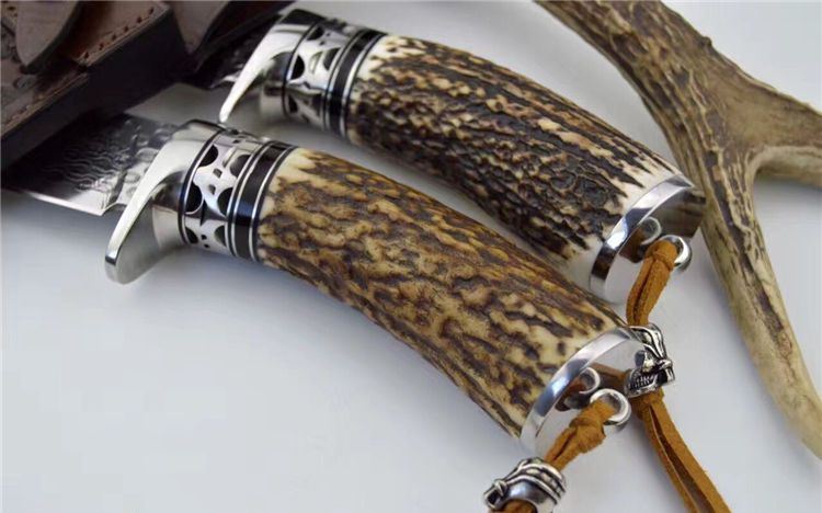 每条鹿角都亲自精挑细选出的粗段鹿角。夹钢大马,雨点纹。不锈钢护手,海盗骷髅头吊坠。配备手工头层牛皮套