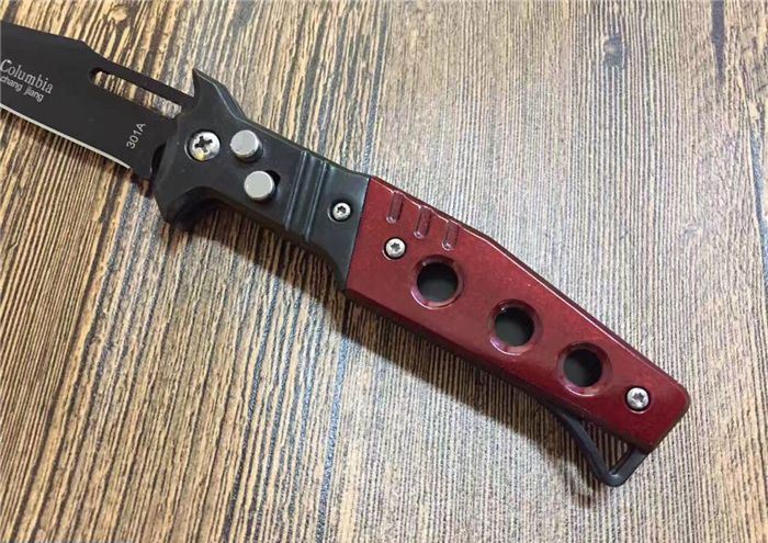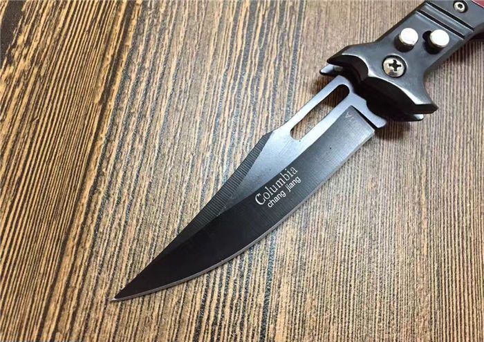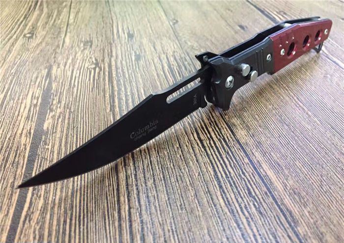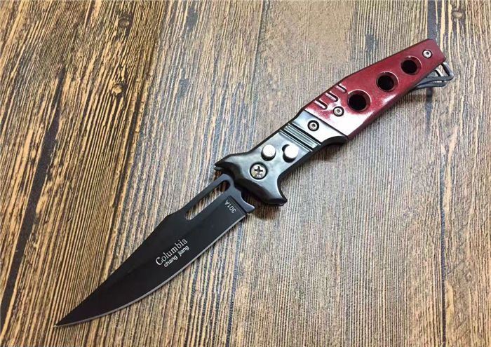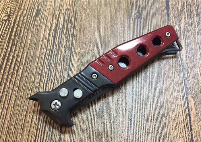红魔鬼跳刀 全 长:20.5CM 刃 长:9CM 刃 厚:1.5mm 刃 材:440 刀 柄:亚克力+不锈钢 开刀方式:弹簧 重 量:115克
