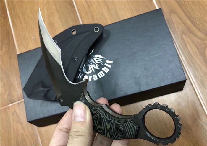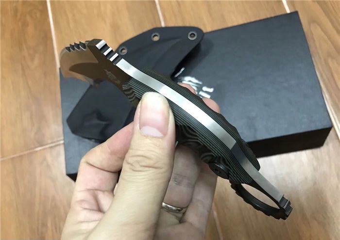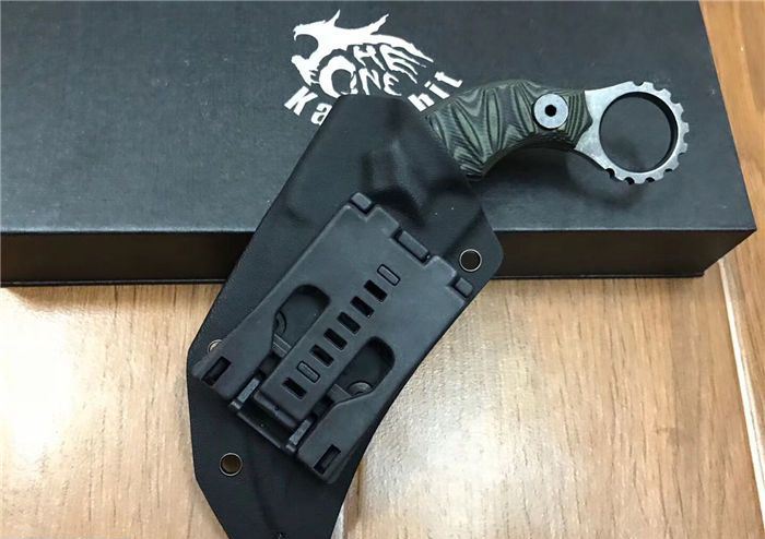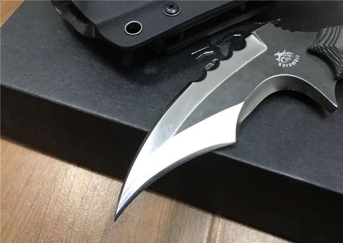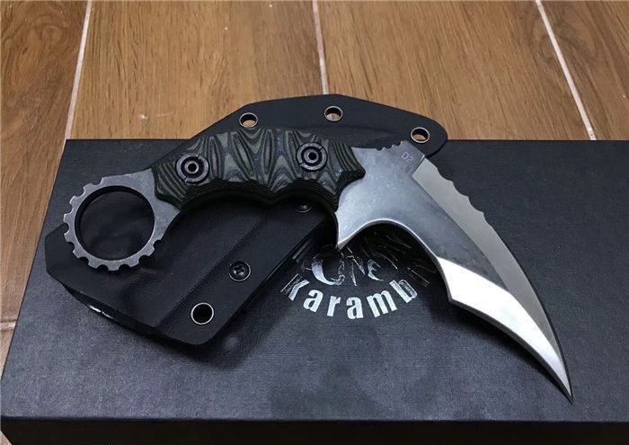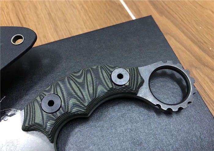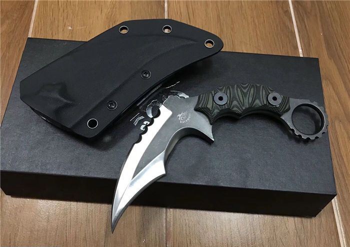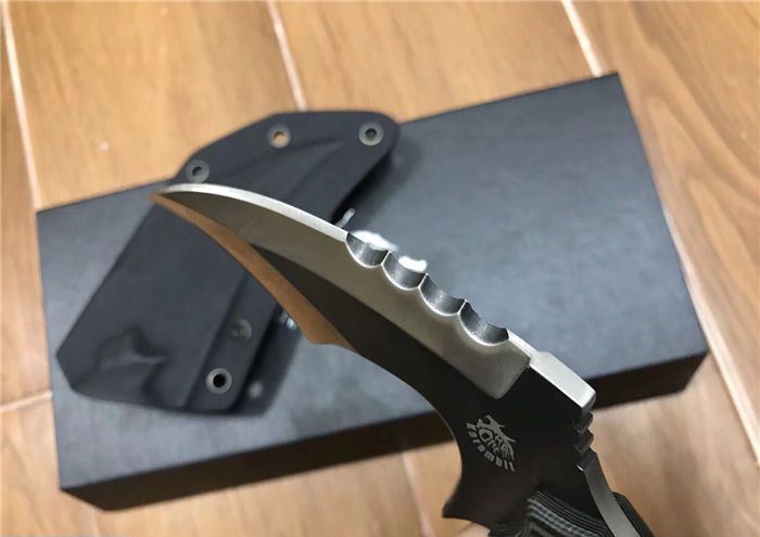 THE ONE死神爪刀 全长:19.8CM 刃长:11.6CM 柄长:7.8CM 刃厚:0.5CM 刃材料:D2 硬度:59-60HRC 表面:沧桑石洗+砂光 刀套:美国进口Kydex 重量:300克(带鞘) 刀柄:A级G10 其它:配精品礼品盒