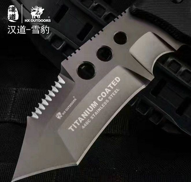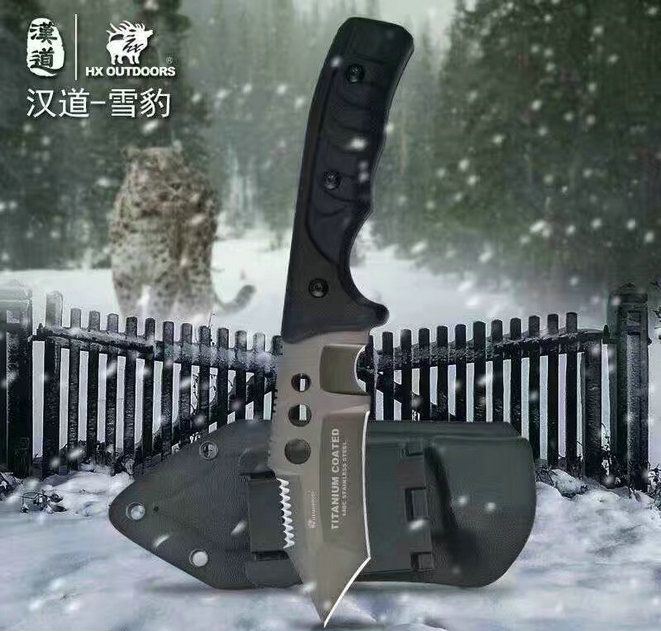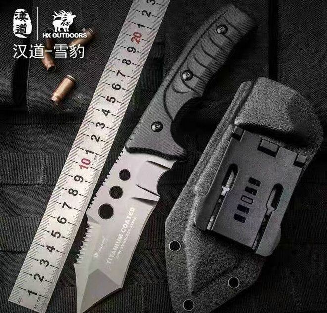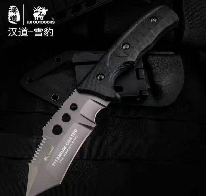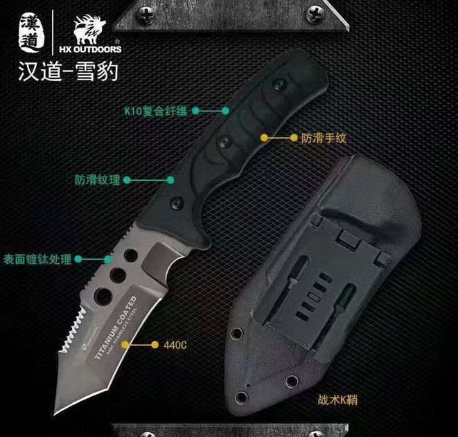 汉道雪豹直刀 汉道雪豹直刀采用440c优质钢材打造,保持了良好的韧性和强度;表面镀钛处理,质感卓越,防锈耐磨;k10复合纤维手柄耐油耐腐,手感舒适;手柄设计贴合手型,配合精细防滑纹里握感更舒适,握拿更稳固;三中刀刃,近柄端弧刃便于削切,适合做一些修饰工作;远柄端主刃便于切砍;刀背齿刃便于切割渔网;配备战术k鞘便于随身安全携带。