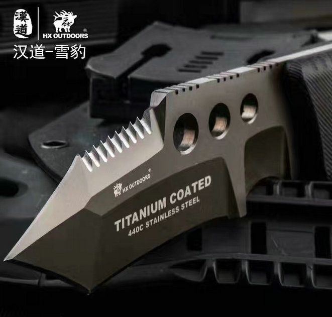 汉道雪豹直刀采用440c优质钢材打造,保持了良好的韧性和强度;表面镀钛处理,质感卓越,防锈耐磨;k10复合纤维手柄耐油耐腐,手感舒适;手柄设计贴合手型,配合精细防滑纹里握感更舒适,握拿更稳固;三中刀刃,近柄端弧刃便于削切,适合做一些修饰工作;远柄端主刃便于切砍;刀背齿刃便于切割渔网;配备战术k鞘便于随身安全携带。