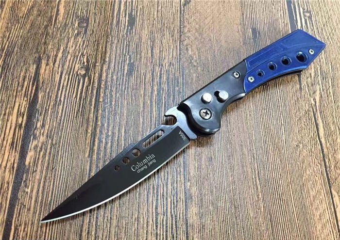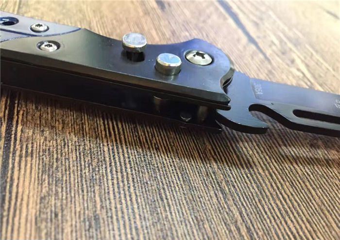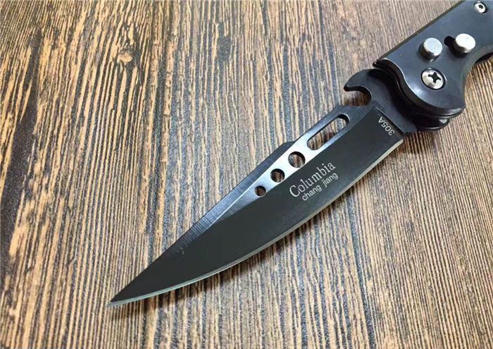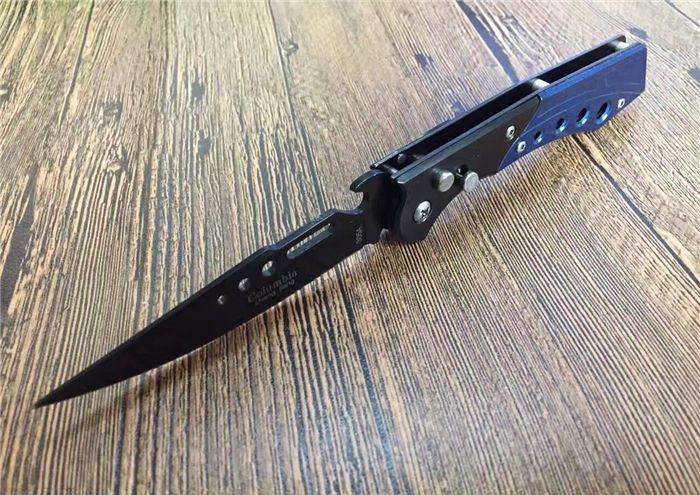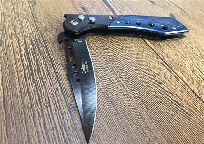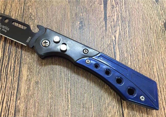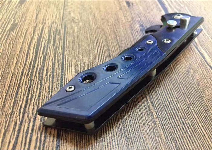 蓝精灵跳刀 全 长:20.5CM 刃 长:9CM 刃 厚:1.5mm 刃 材:440 刀 柄:亚克力+不锈钢 开刀方式:弹簧 重 量:115克