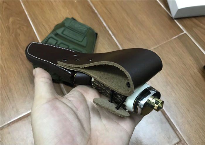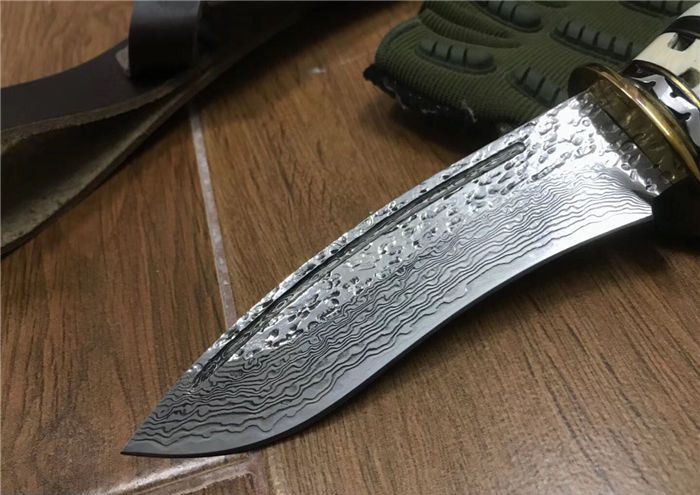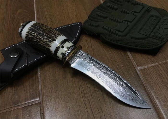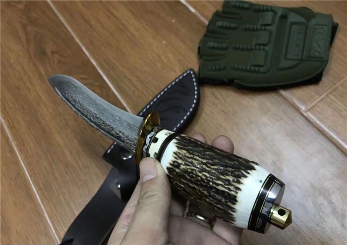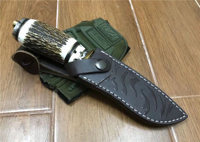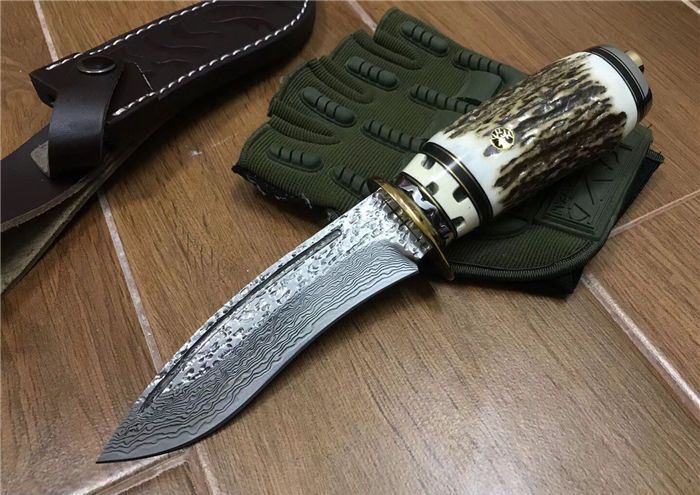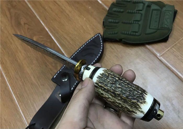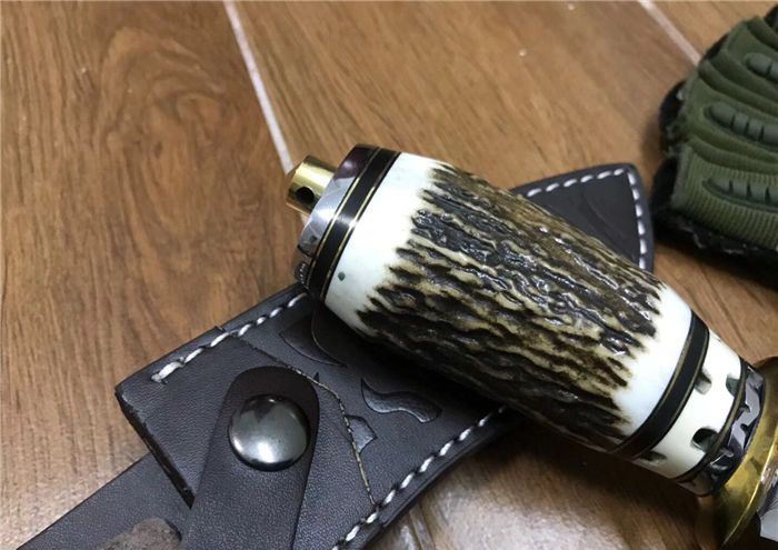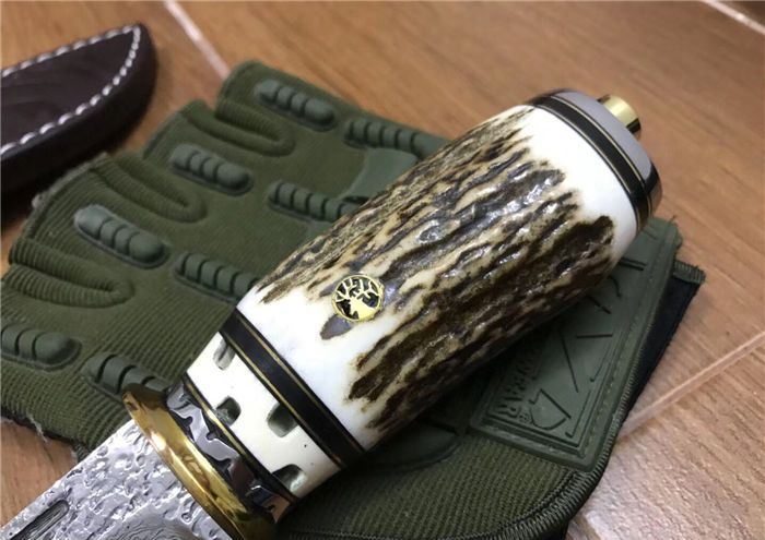 大马士革分解者收藏刀(鹿角版) 全长:24cm 刀刃长度:12cm 厚度:4.2mm 硬度:59-60HRC 手柄用料:黄铜护手+天然鹿角+白钢 配真牛皮刀套 礼盒包装 才用无芯进口大马士革钢刀刃、花纹饱满清晰可见、刀刃锋利可刮汗毛