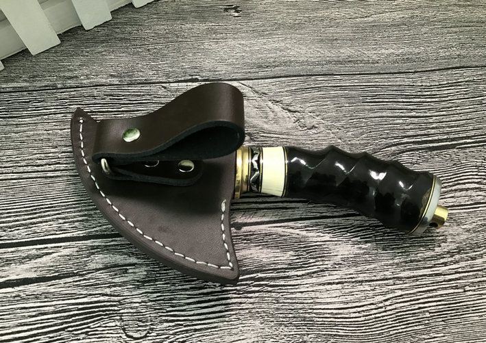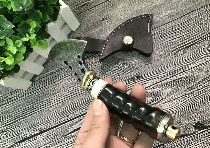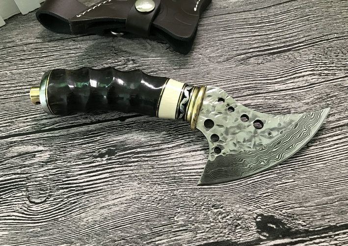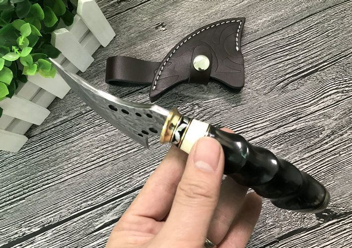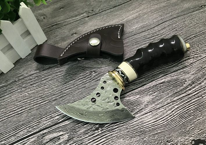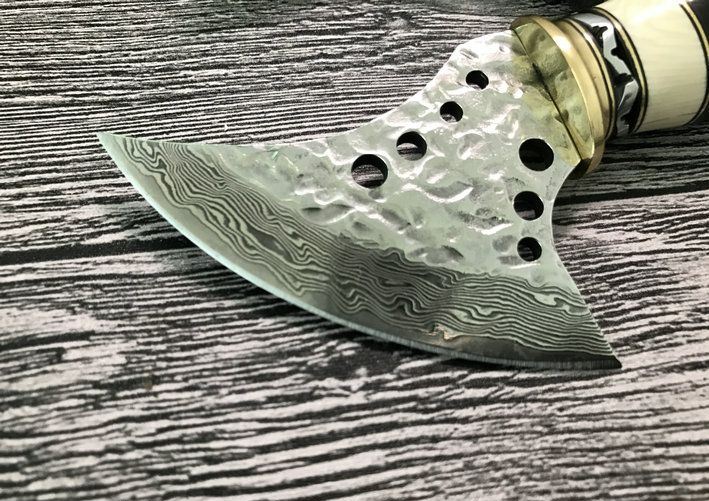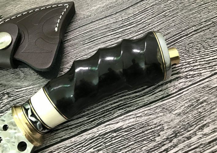 大马士革魔兽战斧 整体全长:18.5cm 刃长:7.5cm 刃最宽处:6.8cm 配置牛皮斧套、精美礼品盒包装 斧刃钢材用料:大马士革钢、80层折叠花纹 钢材厚度:4mm 硬度:59HRC、刀刃孔镂空 手柄材料:纯黄铜护手+钢片打花+白牛骨+天然黄羊角柄、刀刃二次开刃、非常锋利