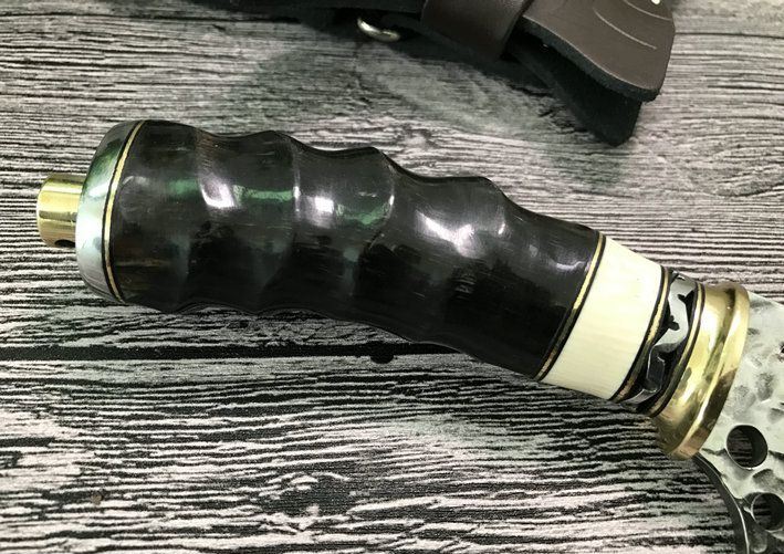 手柄材料:纯黄铜护手+钢片打花+白牛骨+天然黄羊角柄、刀刃二次开刃、非常锋利