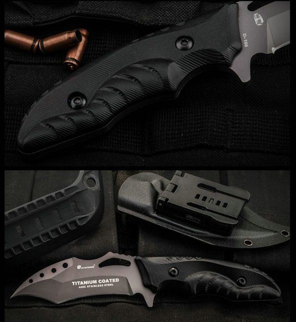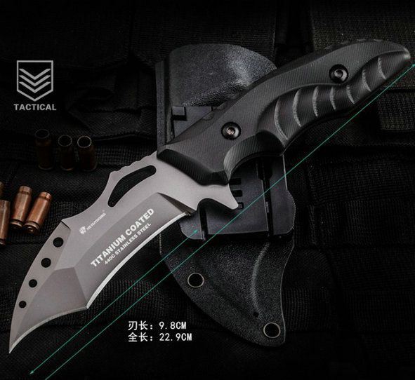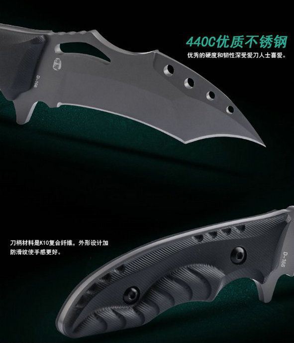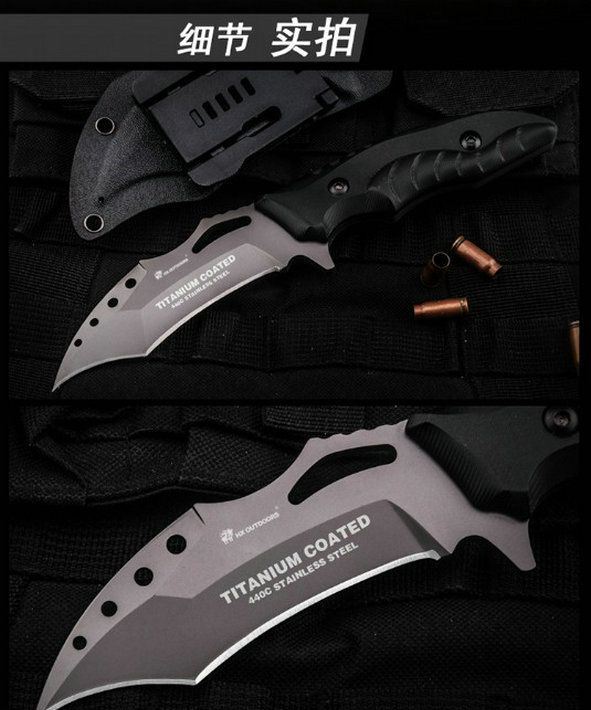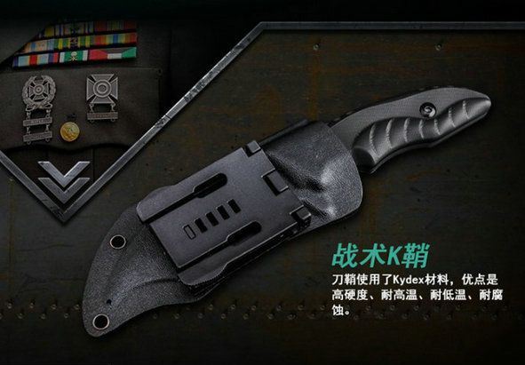 采用440c优质钢材打造,具有优秀的硬度和韧性;表面真空镀钛处理,质感卓越,防锈耐磨;k10复合纤维手柄耐油耐腐,手感舒适;手柄设计贴合手型,防滑手纹精致细密,握感舒适,握拿更稳固;远柄端下勾弧刃坚韧犀利,气势逼人,适合穿刺攻击;远柄端主刃便于切削;配备战术k鞘,硬度高耐高温耐油腻