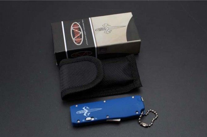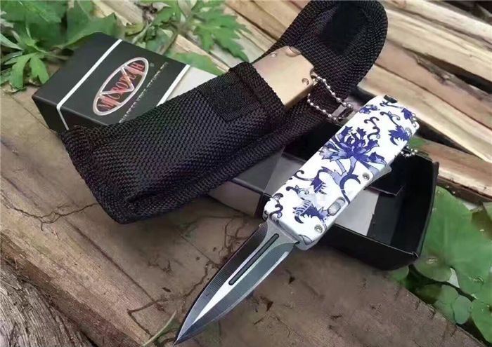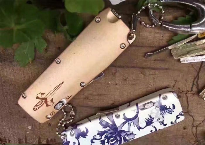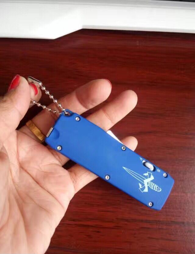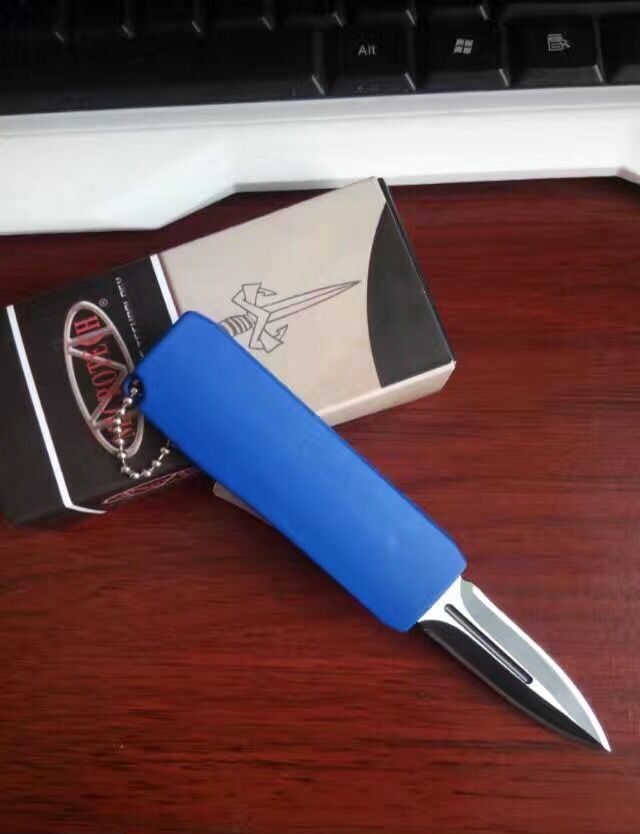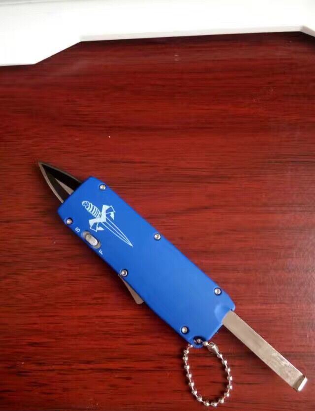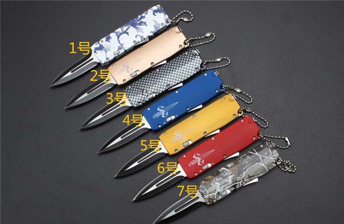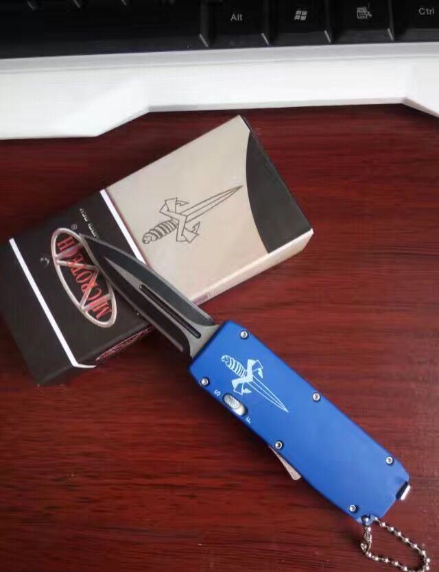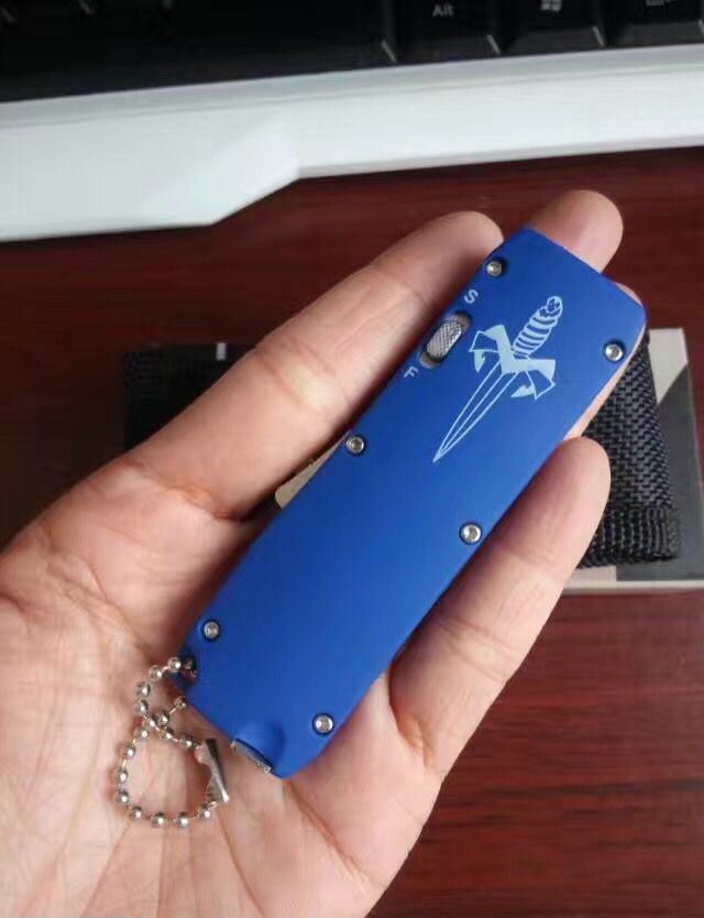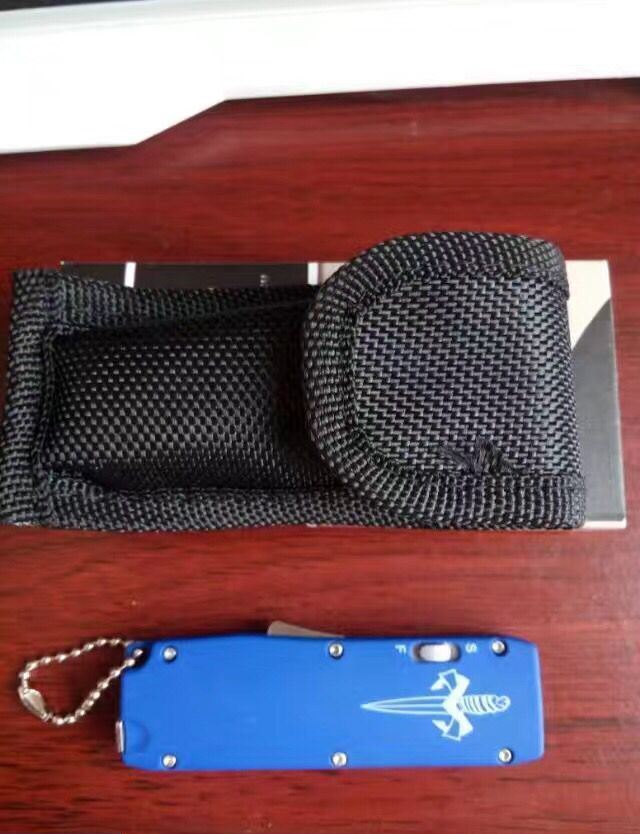 微技术迷你直跳弹簧刀 全 长:13.8cm 刃 长:5.5cm 刃 厚:1.8mm 刃 材:440 硬 度:57HRC 表 面:黑白钢 刀 鞘:尼龙 锁 闭:直出弹簧刀