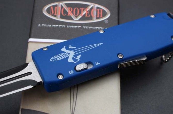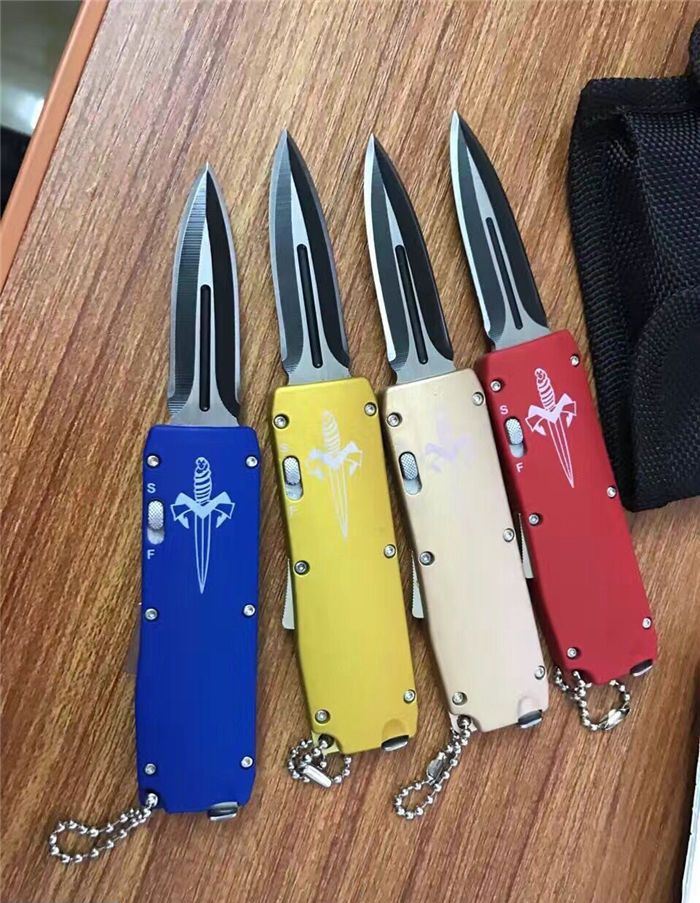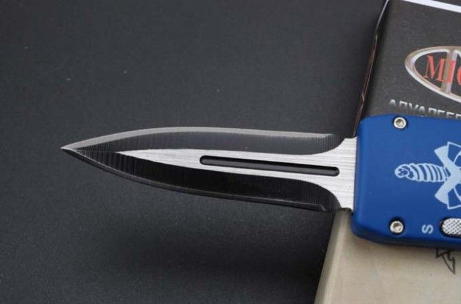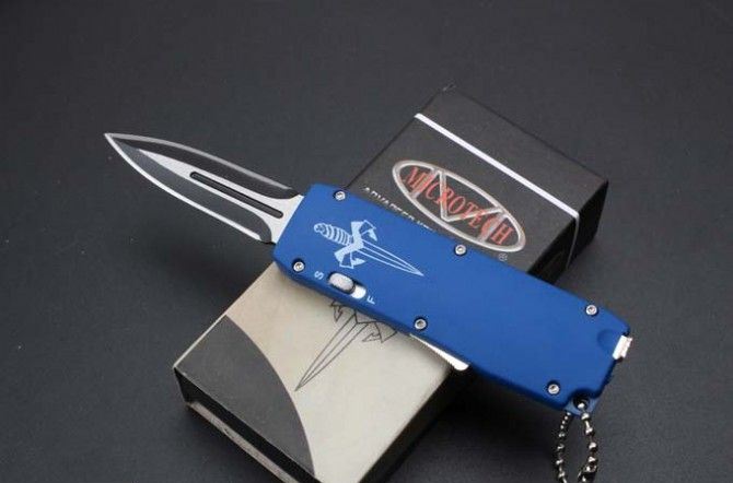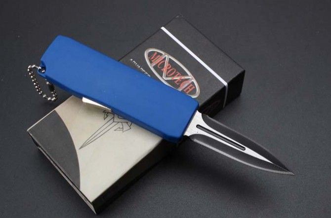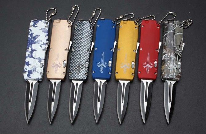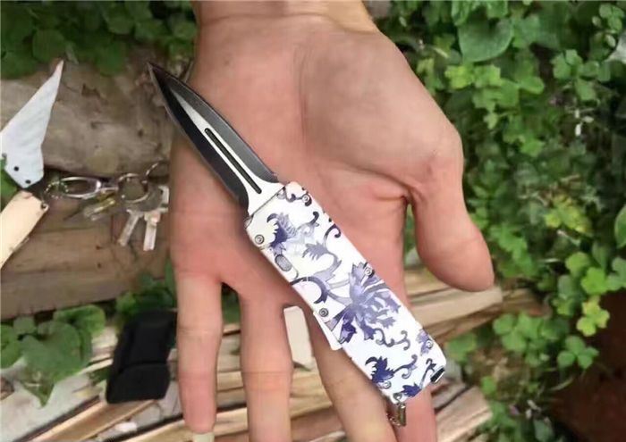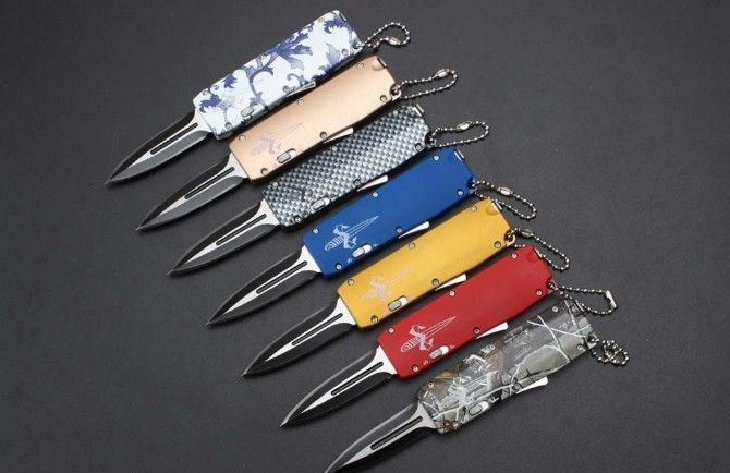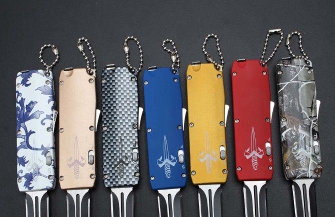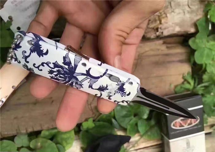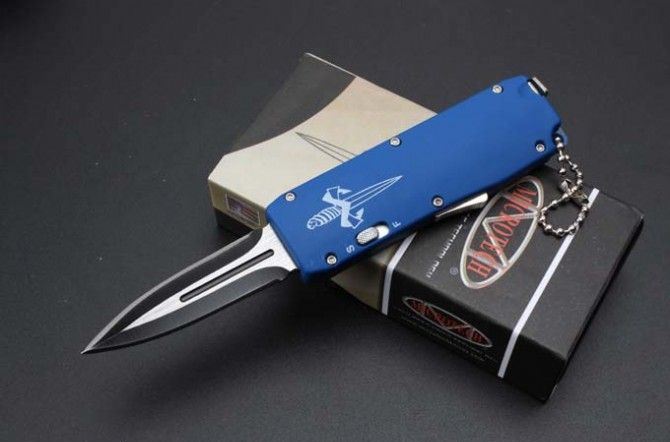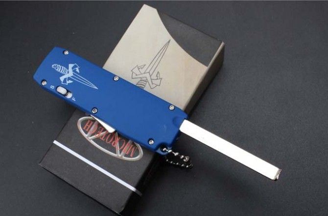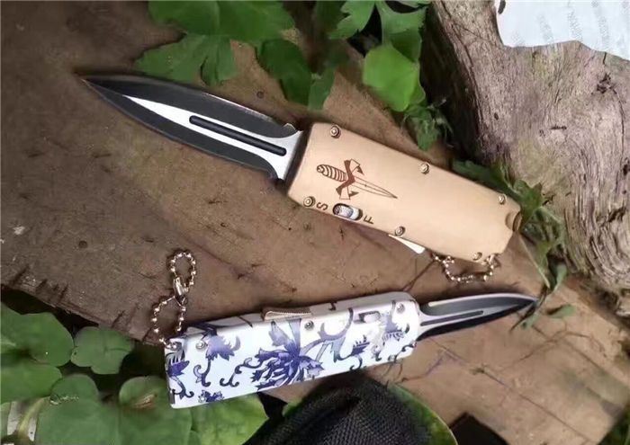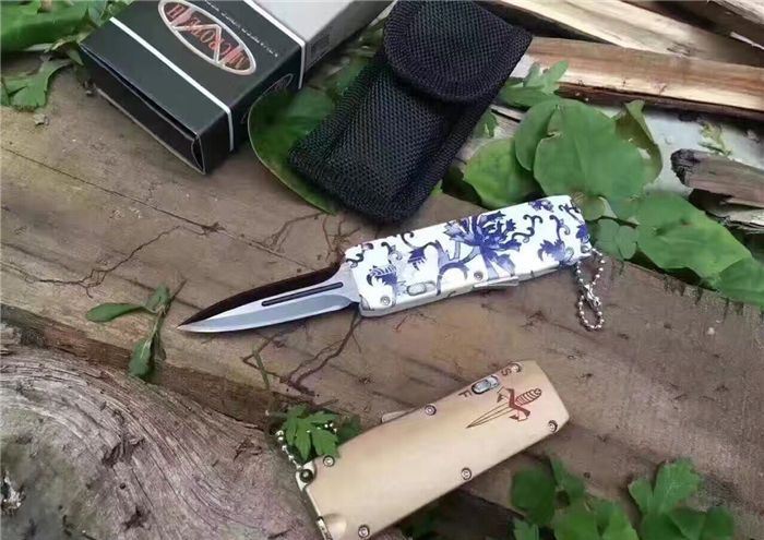 微技术迷你直跳弹簧刀 全 长:13.8cm 刃 长:5.5cm 刃 厚:1.8mm 刃 材:440 硬 度:57HRC 表 面:黑白钢 刀 鞘:尼龙 锁 闭:直出弹簧刀