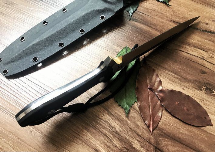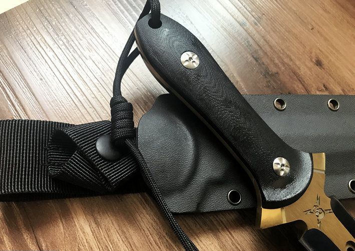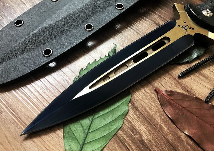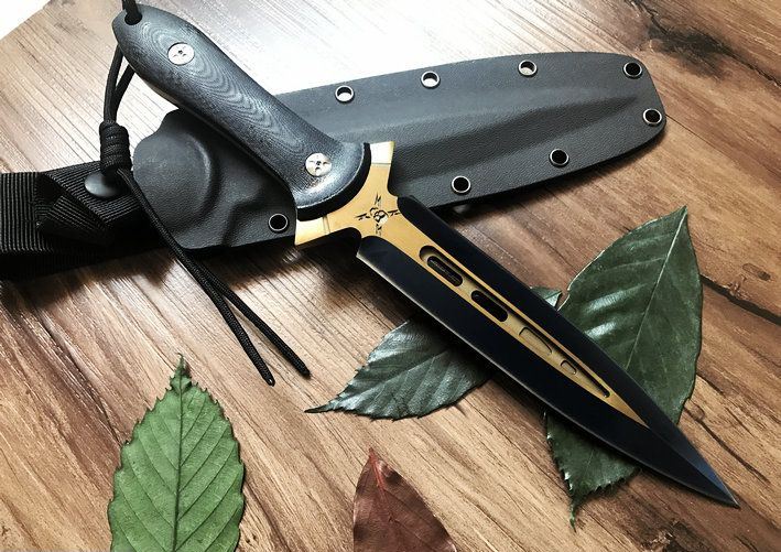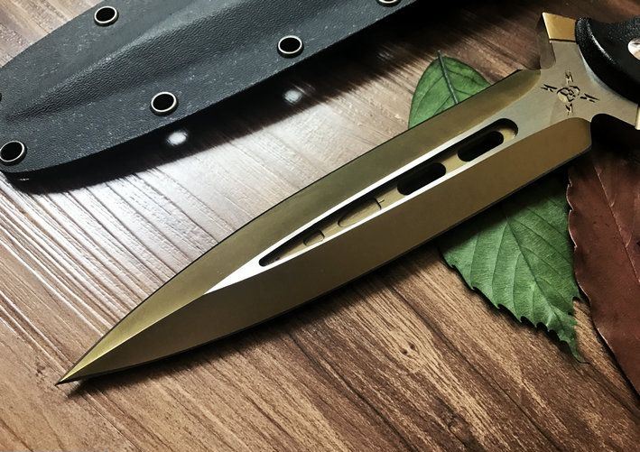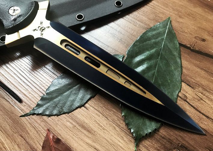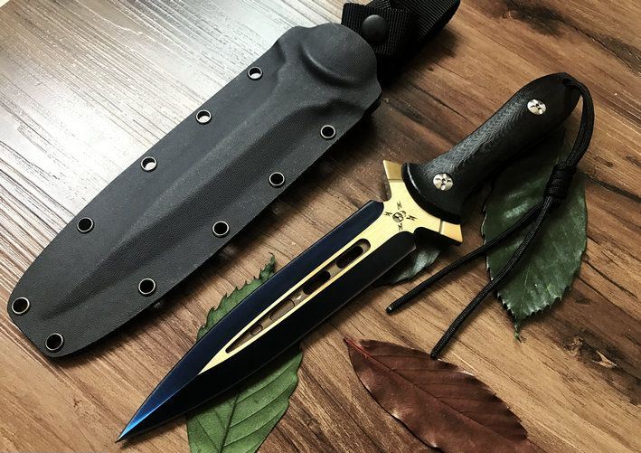 鬼影双锋直刀(金色+拉丝) 全长:30CM 刃长:17.6CM 柄长:12.4CM 刃材:9Cr18M0V 刃厚:1CM 表面:镀钛 硬度:58C 柄材:G10 刀鞘:美国进口Kydex 重量:净重约400g,约毛重770g(含礼品盒,刀套)