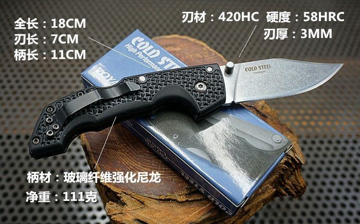 冷钢COLD海航家小折刀 全 长:18cm 刃 长:7cm 柄 长:11cm 刃 厚:3mm 刃 材:420HC 硬 度:58HRC 柄 材:玻璃纤维强化尼龙 重 量:111g(含包装)