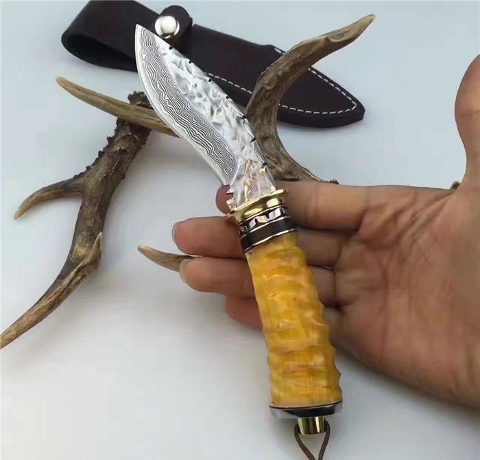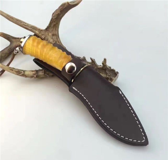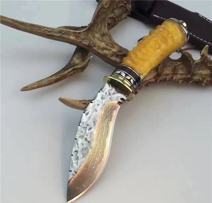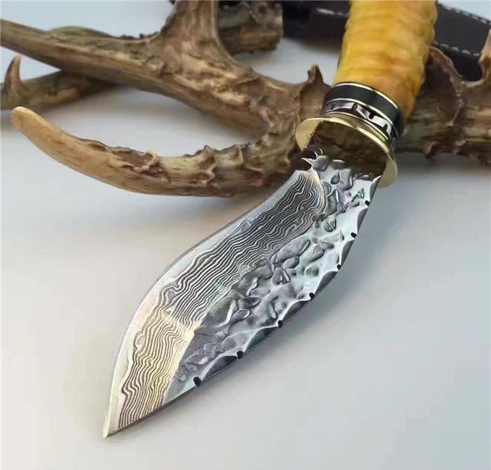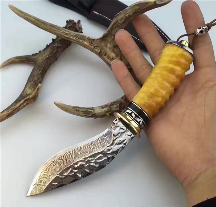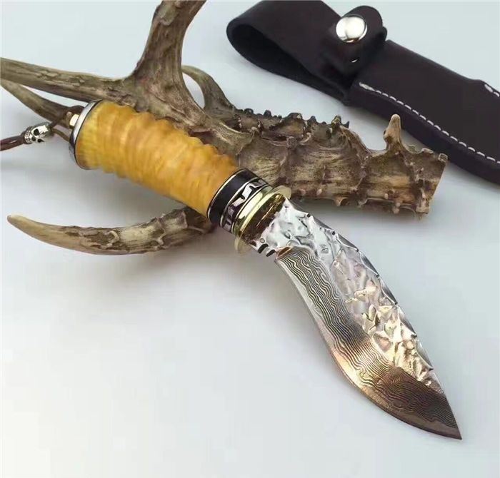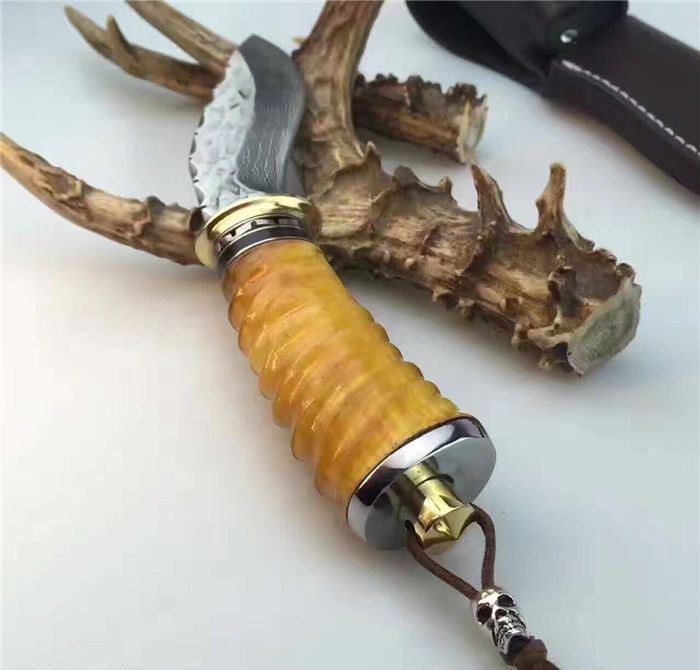 刀刃为锻打大马士革钢、刃背手工打刻鱼骨齿、手柄尾部采用天然黄羊角+骷髅头吊坠