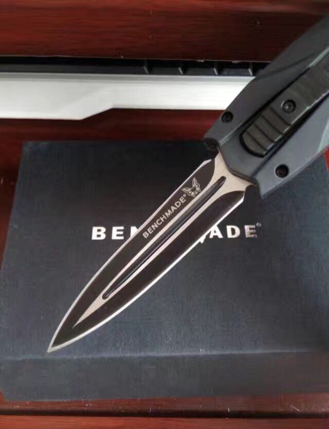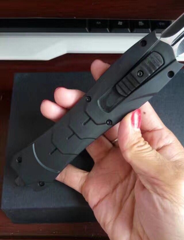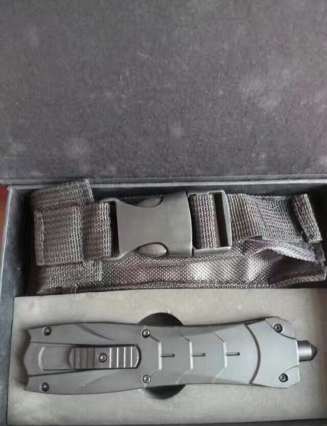 黑邪神蝴蝶直跳刀 全 长:23.5cm 刃 长:9.6cm 刃 厚:1.8mm 刃 材:440 硬 度:57HRC 刀 重:200g 表 面:黑白钢 柄 材:橡胶防滑 刀 鞘:尼龙 锁 闭:直出弹簧刀