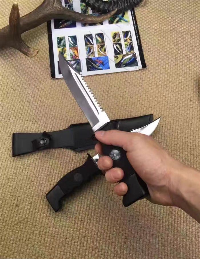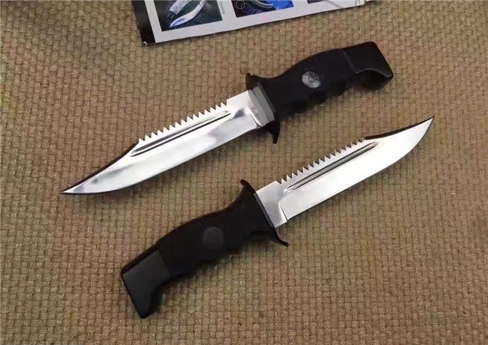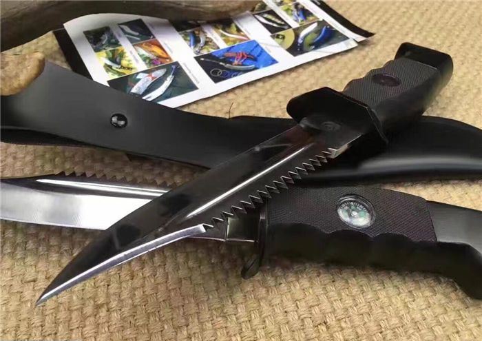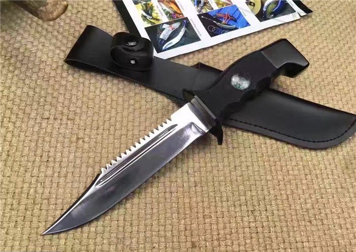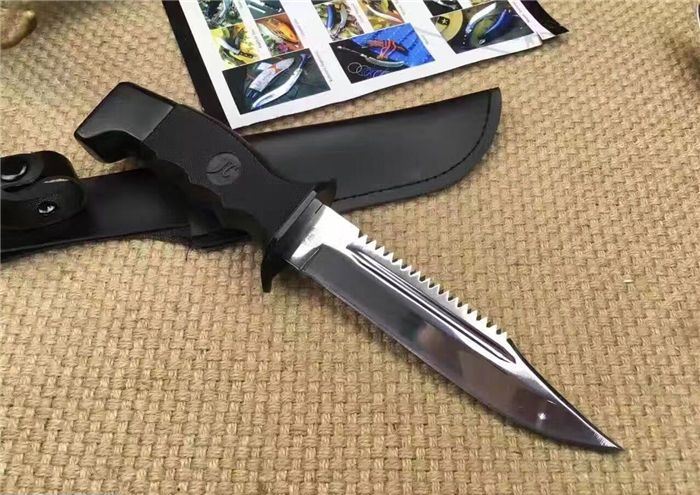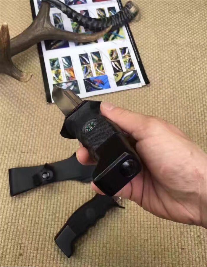 精仿警用匕首 全 长: 26cm 刃 长: 14.5cm 刃 厚: 4mm 刃 材: 440HC 硬 度: 58HRC 重 量: 450g 表 面: 镜光 柄 材: 橡塑+指南针+钢尾 刀 鞘: 皮