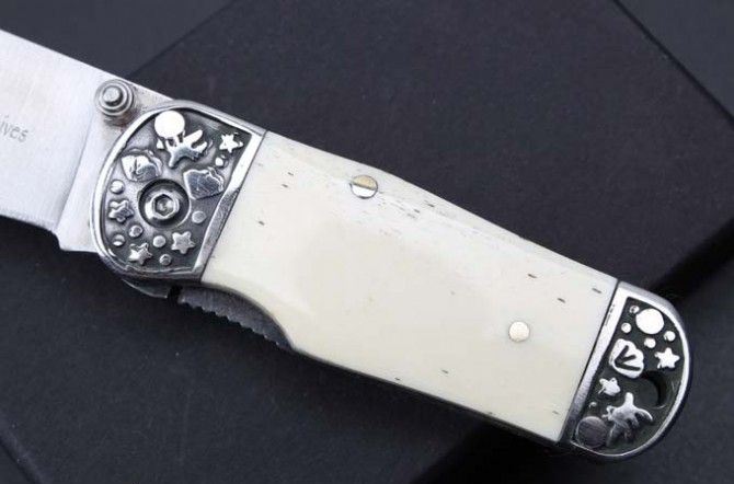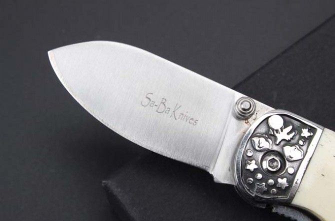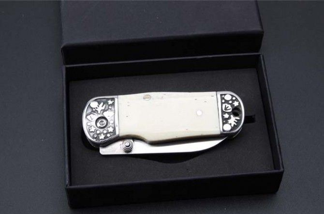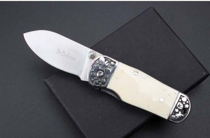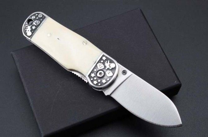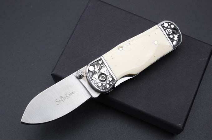 白骨双钢头折刀 全长:12CM 刃长:5CM 柄长:7CM 刃宽:2.3CM 刃厚:2.8MM 刃材:7CR15 柄材:双白钢头+牛骨 硬度:58HRC 表面处理:沙光 刀套:无 重量(含包装):97g