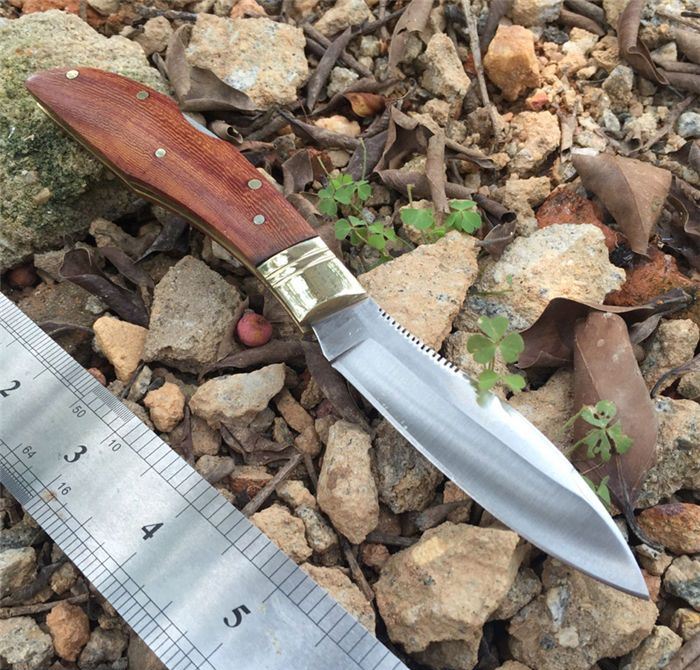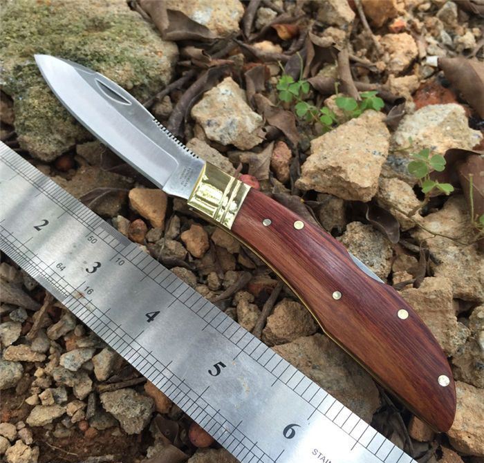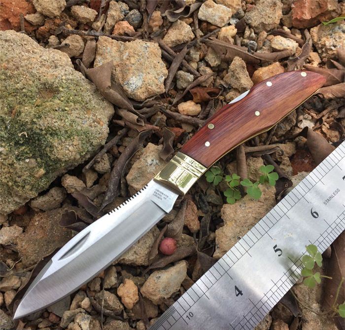 加拿大格罗曼精品传统折刀 全长:18CM 刃长:8CM 刃厚:0.3CM 刃材料:440(非常锋利) 柄材料:铜铆花梨 重量:85克 出口尾货,售完即止! 加拿大格罗曼品牌代工产品,品质一流,传统手作工艺,刀柄采用南美花梨(俗称巴花),铜内衬,搭配白铜头,精工抛磨;传统背锁小刀,铆合非常到位,做到严丝合缝,开合顺畅,手感一流,是不可多得的精品小刀,非常适合收藏和把玩!
